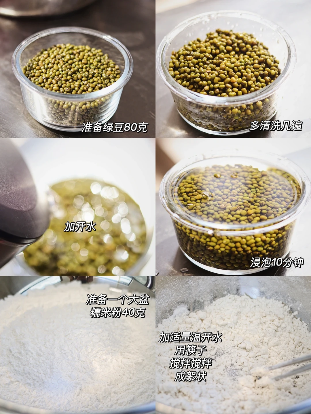 2.准备80克绿豆,清洗几遍,放入碗中,加开水浸泡10分钟。