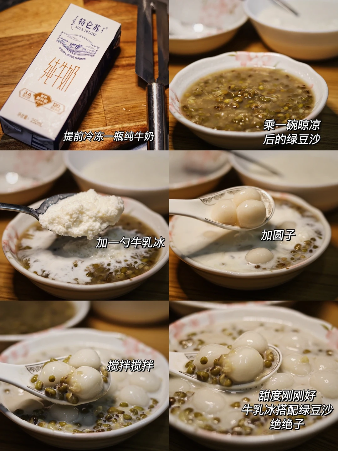 🍃食材:绿豆80克,糯米粉40克,冰糖适量,纯牛奶一瓶。