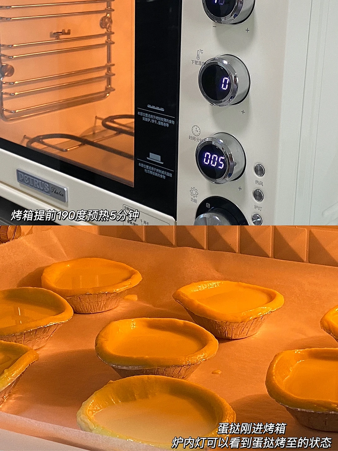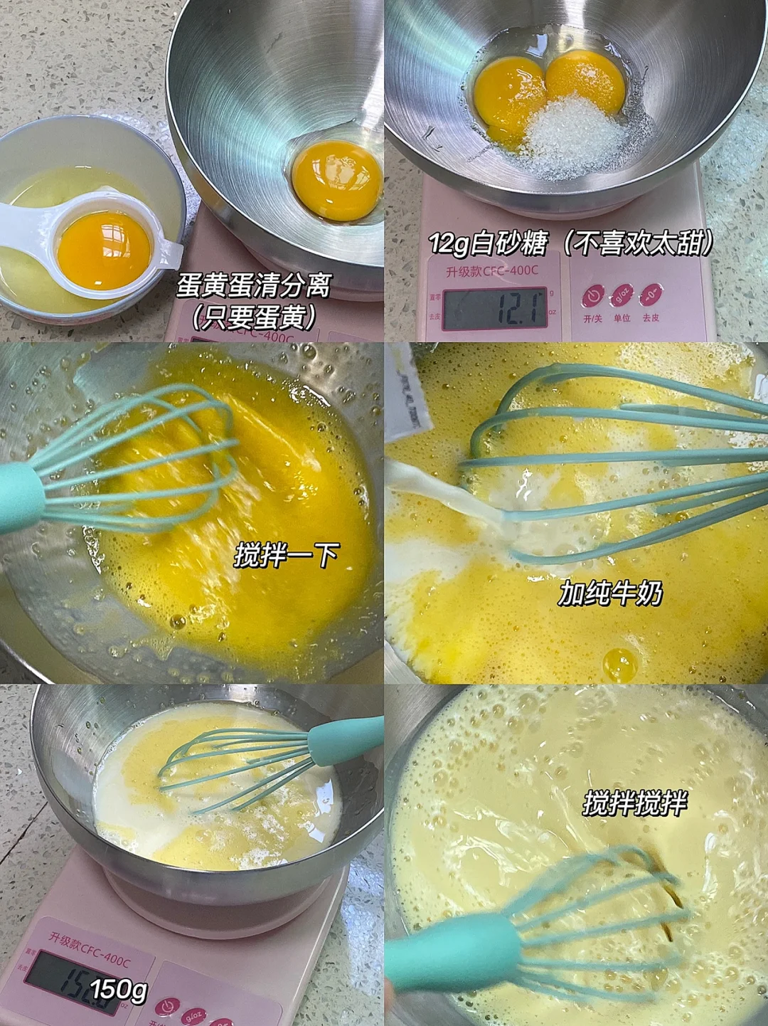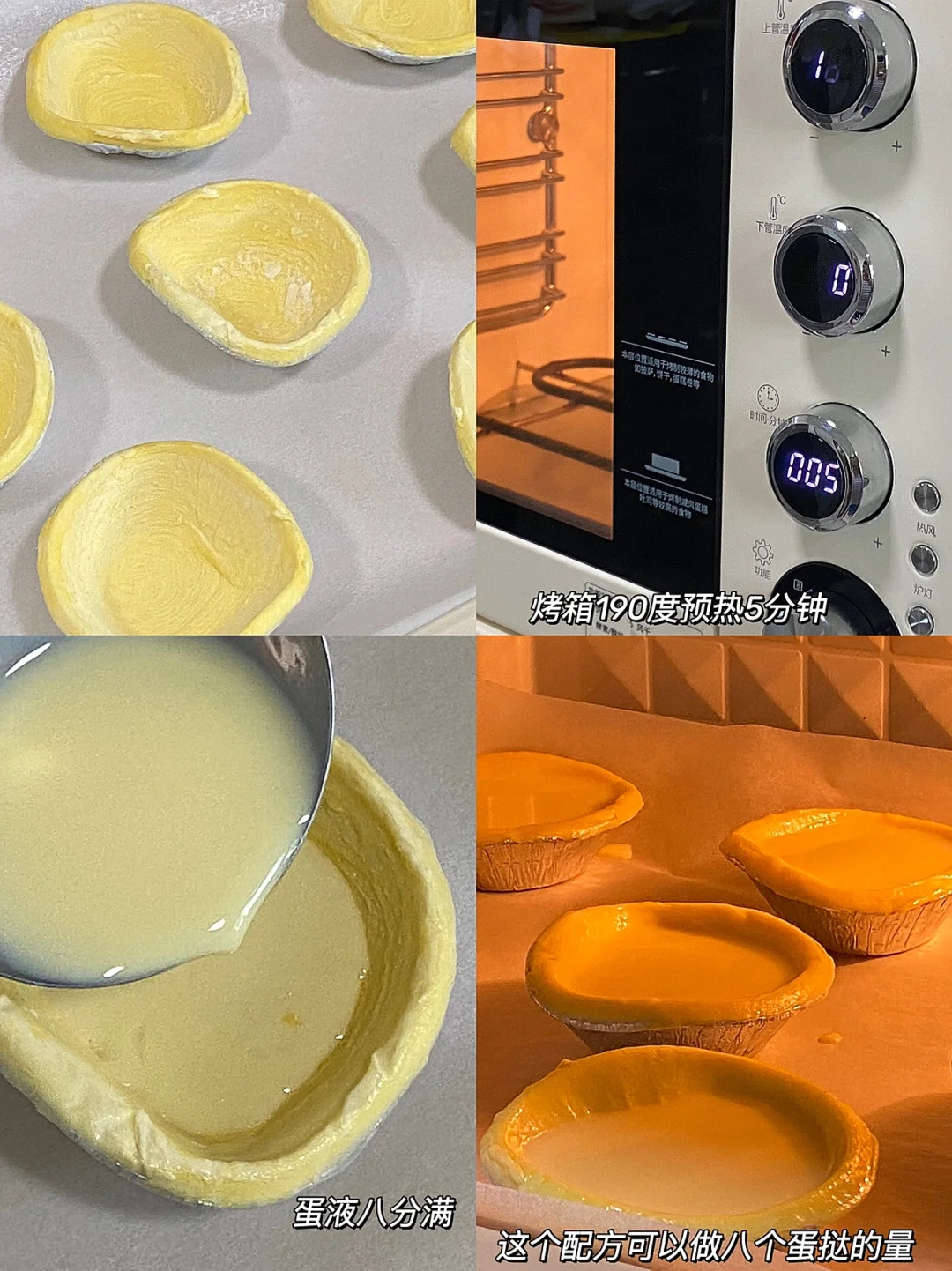 🧁食材:蛋黄两个,白砂糖12g,纯牛奶150g,炼奶15g,蛋挞皮8个,柠檬汁适量。 🧁做法:1.蛋清蛋黄分离,白砂糖12g(个人不喜欢太甜的),搅拌一下,加纯牛奶150g、搅拌搅拌。 2.加一勺炼奶(12g左右)过滤两遍会更加细腻,加几滴柠檬汁会去腥,搅拌搅拌,静置10分钟。 3.蛋挞皮解冻15分钟,烤箱190度预热5分钟,蛋液八分满,这个配方刚刚好做八个蛋挞的量。 4.190度烤制30分钟左右,要观察上色情况,以免烤焦。 🧁出炉后趁热吃,完胜KFC!!!