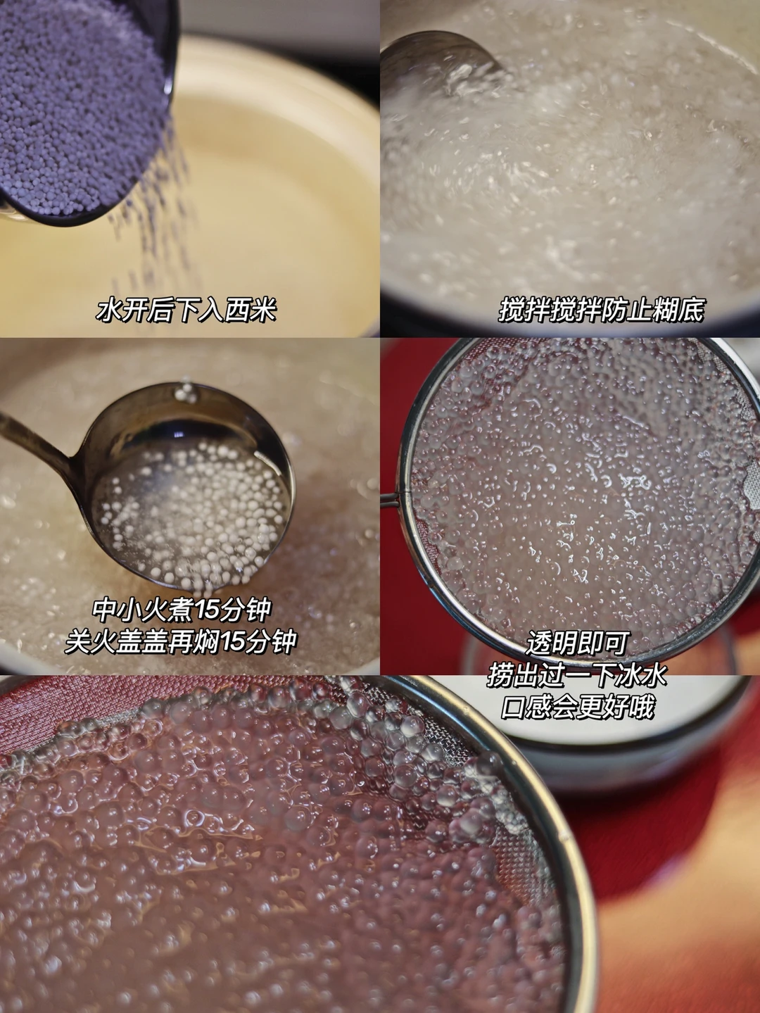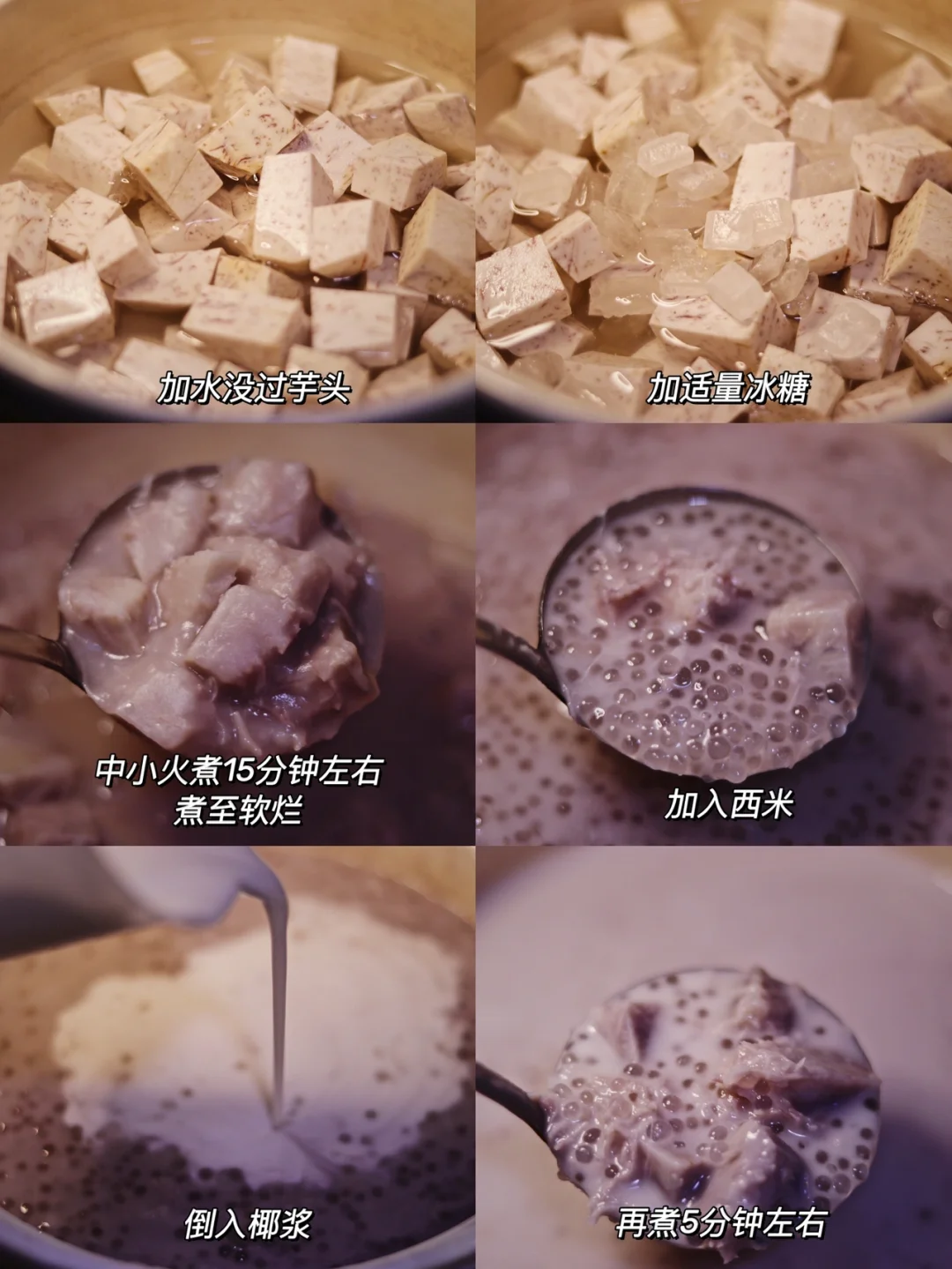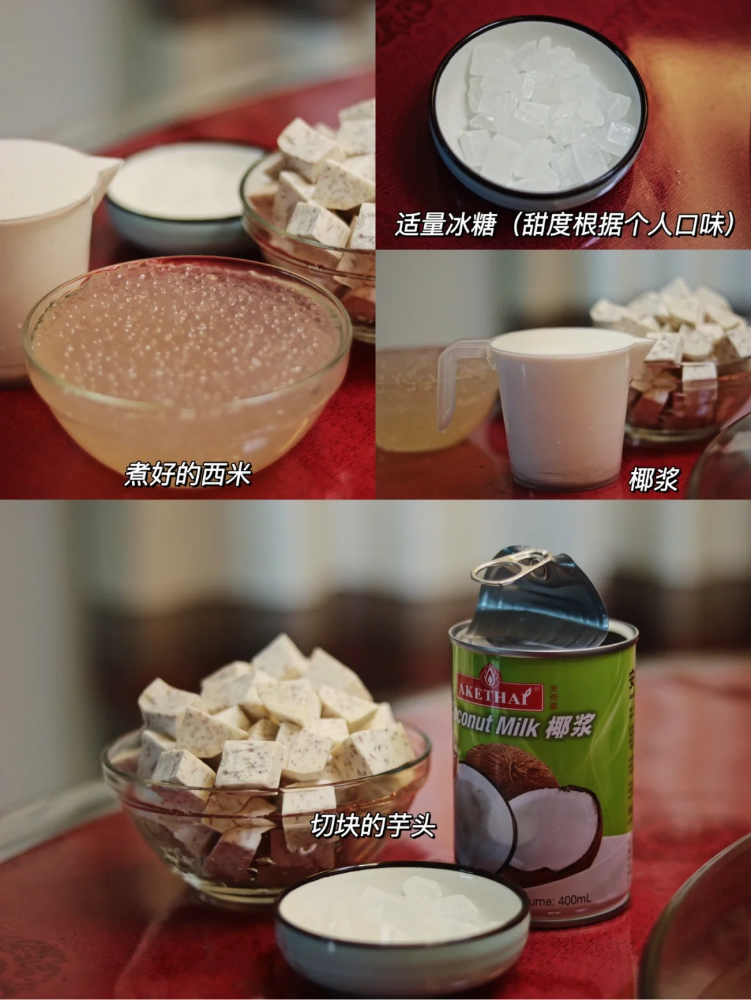 食材:芋头、适量冰糖、西米、椰浆。 做法:1.先来煮西米,水开后下西米,搅拌搅拌防止糊底,中小火煮15分钟,关火盖盖焖15分钟,煮至透明即可捞出过下冰水,口感会更好哦! 2.芋头提前去皮切块,加水没过芋头,加适量冰糖,中小火煮15分钟左右,煮至软烂。 3.加入西米、椰浆,再煮5分钟左右。 4.做好后放进冰箱冰镇一下,夏日喝特别爽😋 香甜软糯的芋头搭配着糯叽叽的西米椰香十足,别提有多幸福[赞R]
