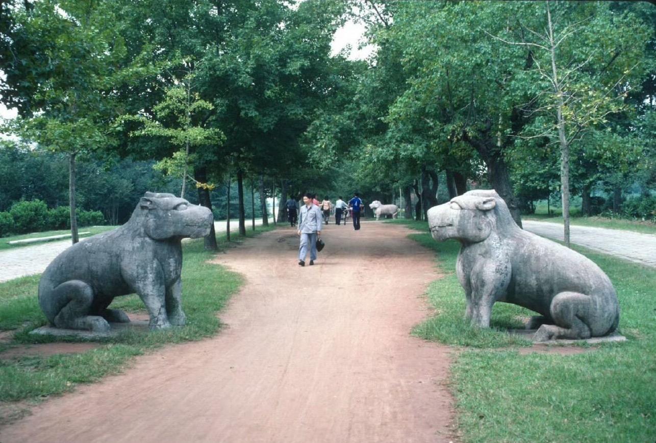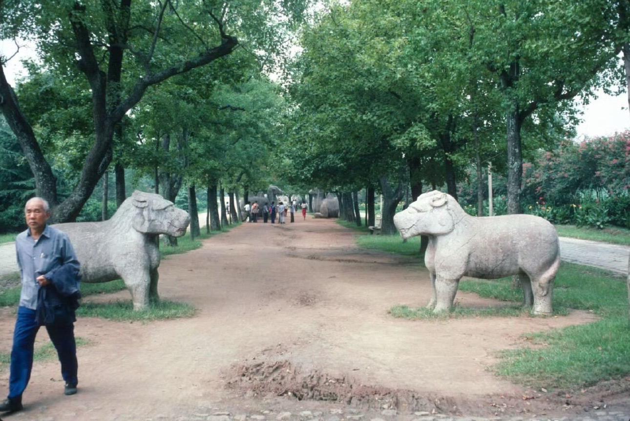 1984年南京夏日。1984 年的夏日,石马雕像旁孩童嬉闹,神道石像生...