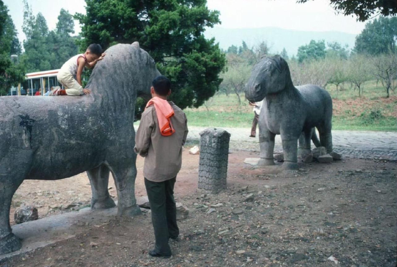 1984年南京夏日。1984年的夏日,石马雕像旁孩童嬉闹,神道石像生...