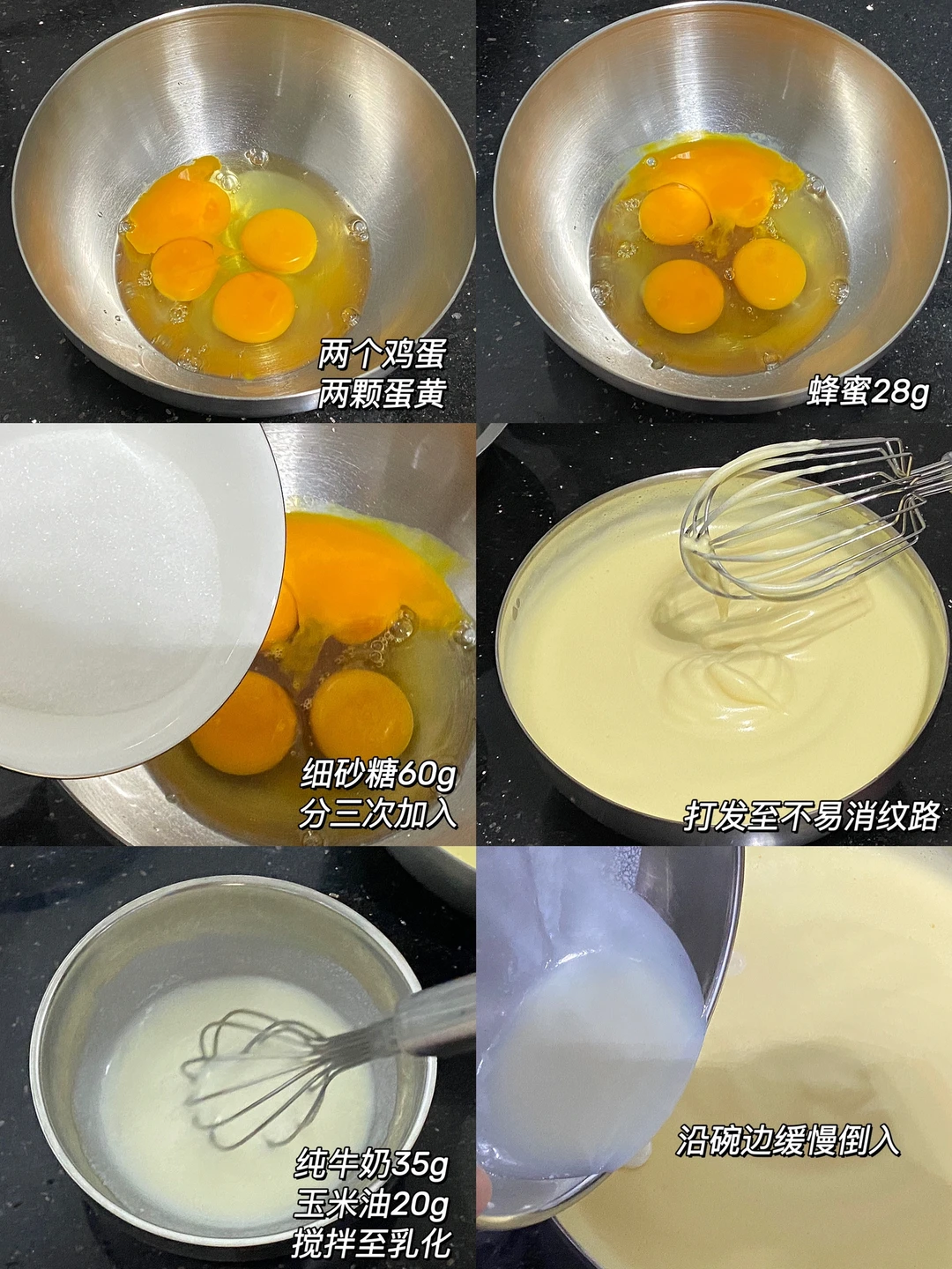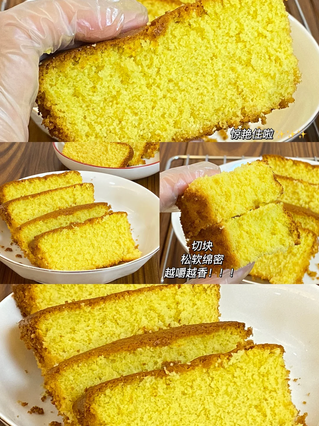 🌷食材:两个鸡蛋(常温)两颗蛋黄(常温)蜂蜜28g,细砂糖60g,牛奶35g,玉米油20g,低筋面粉100g。 🌷做法:1.两个鸡蛋、蛋黄、蜂蜜搅拌均匀。 2.分三次加入细砂糖,打发至纹路不易消失。 3.纯牛奶、玉米油搅拌至乳化,沿碗边缓慢倒入,筛入低筋粉,翻拌至无干粉(J字形)倒入模具(记得一定要垫油纸) 4.烤箱170度预热10分钟,160烤制40分钟,出炉后晾凉冰箱冷藏一晚。 🌷松软绵密,越嚼越香,惊艳住啦[赞R][赞R][赞R]