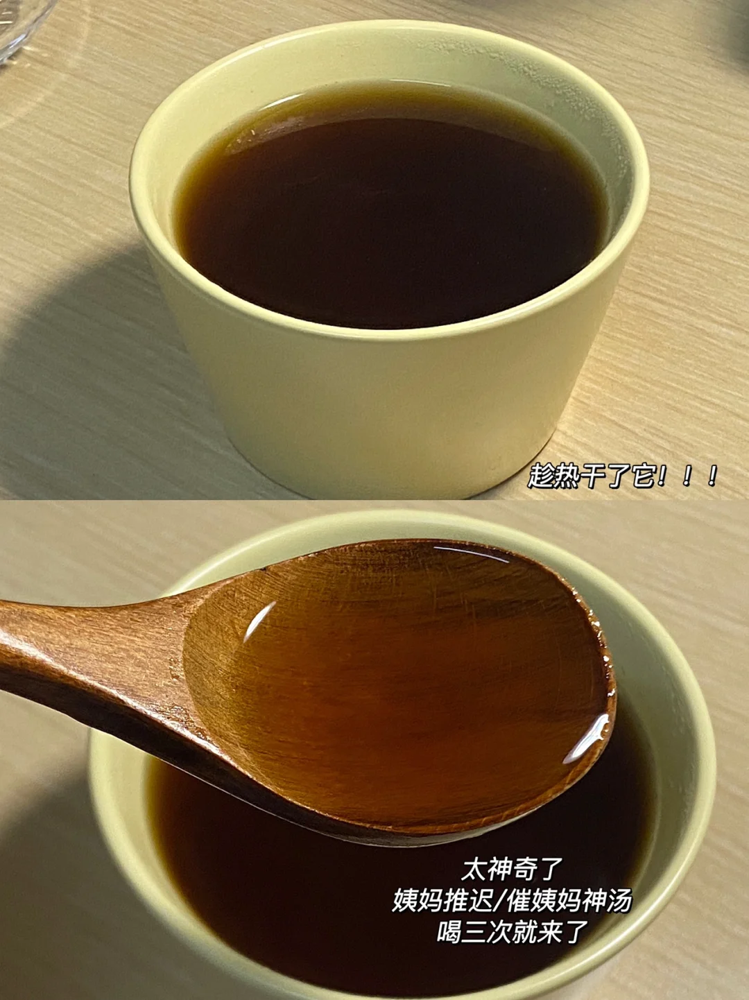 🧚♀️趁热干了它!!!渣也可以吃掉,我就喝了三次就来了,真的太神了,这个水不要太多,就按照图片的差不多的量就可以了,昨天喝两碗,刚刚又煮了一锅,喝了一碗,结果肚子就有点儿胀胀的,真的来了,真的太激动了!!!姨妈延迟了一个多月,心里真的慌,可能是最近作息不规律造成的,但来了就好,热乎的姨妈太不容易了!!!