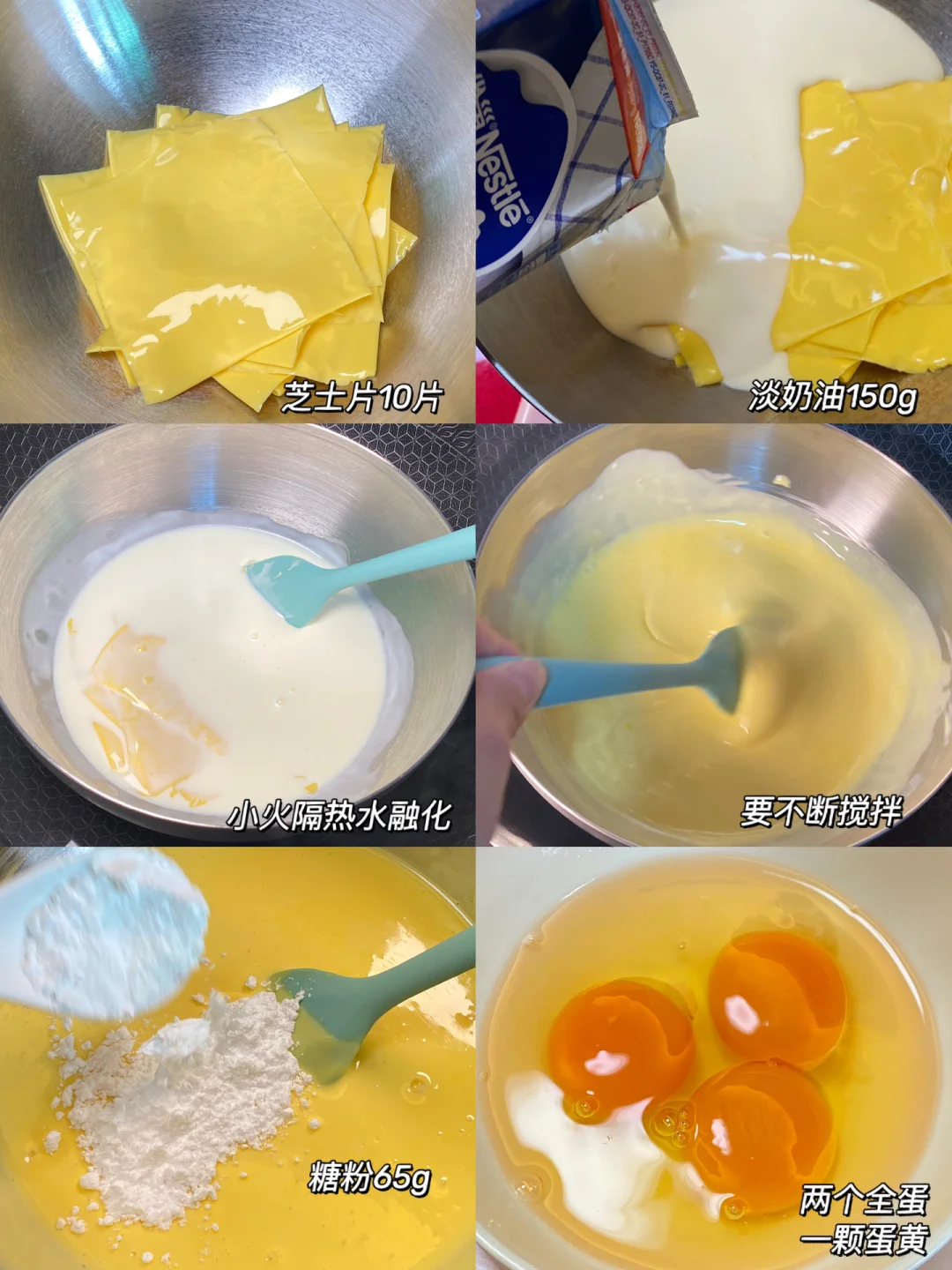 🍓食材:芝士片10片(妙可蓝多,约160g)淡奶油一瓶250g(雀巢)糖粉65g,两个全蛋、一颗蛋黄,玉米淀粉12g,柠檬汁。