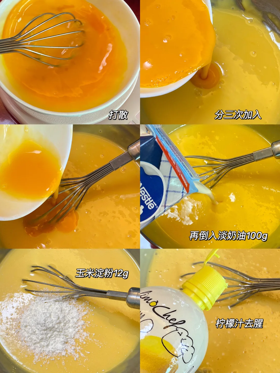 2.鸡蛋打散,分三次加入,再加入,倒入淡奶油100g,再加入玉米淀粉搅拌均匀,柠檬汁去腥。