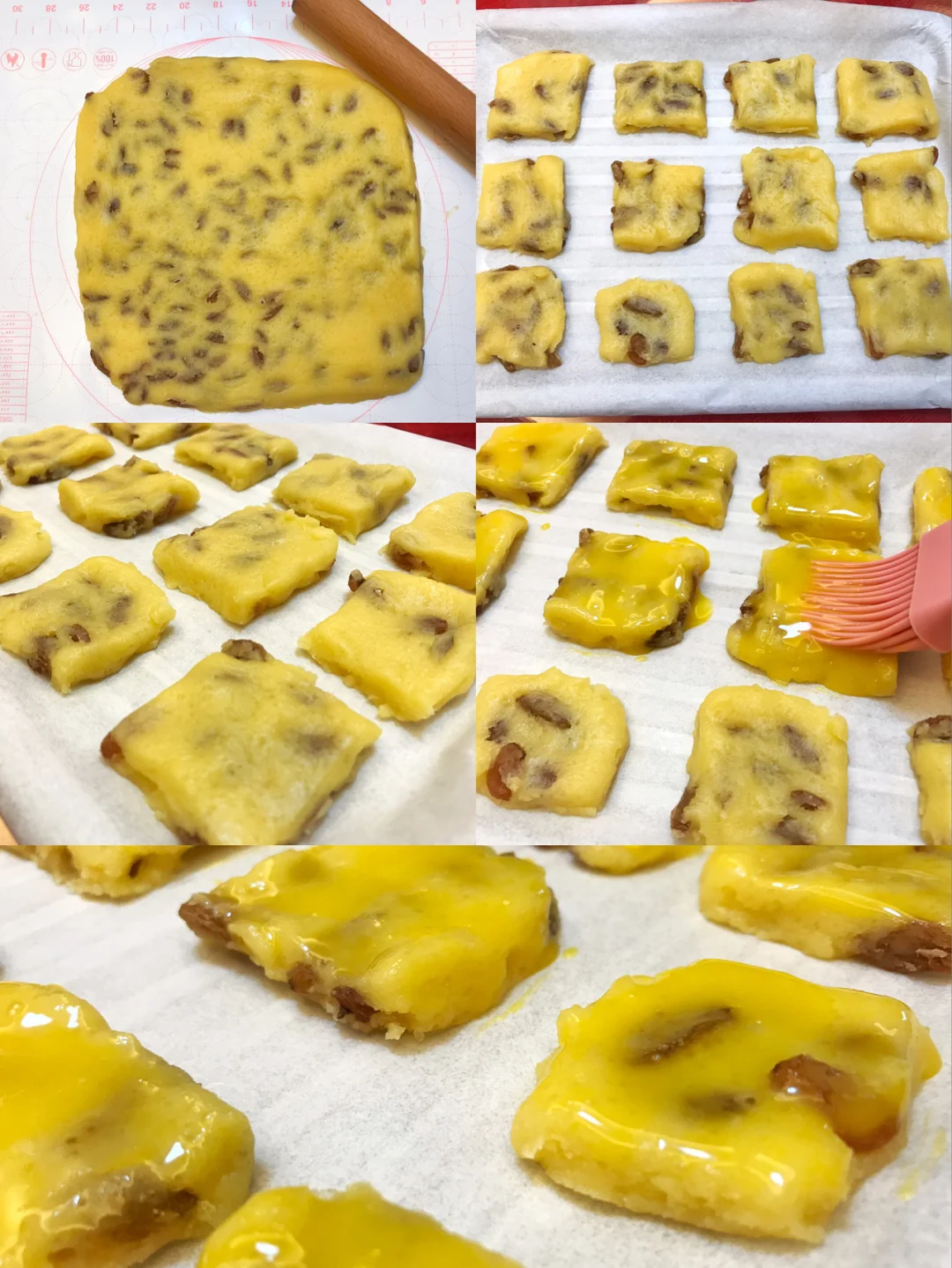 🐰食材:无盐黄油80克,低筋粉180克,白糖30克(因糖粉用完了)葡萄干40克,奶粉20克,蛋黄3个(留一个来刷表面)