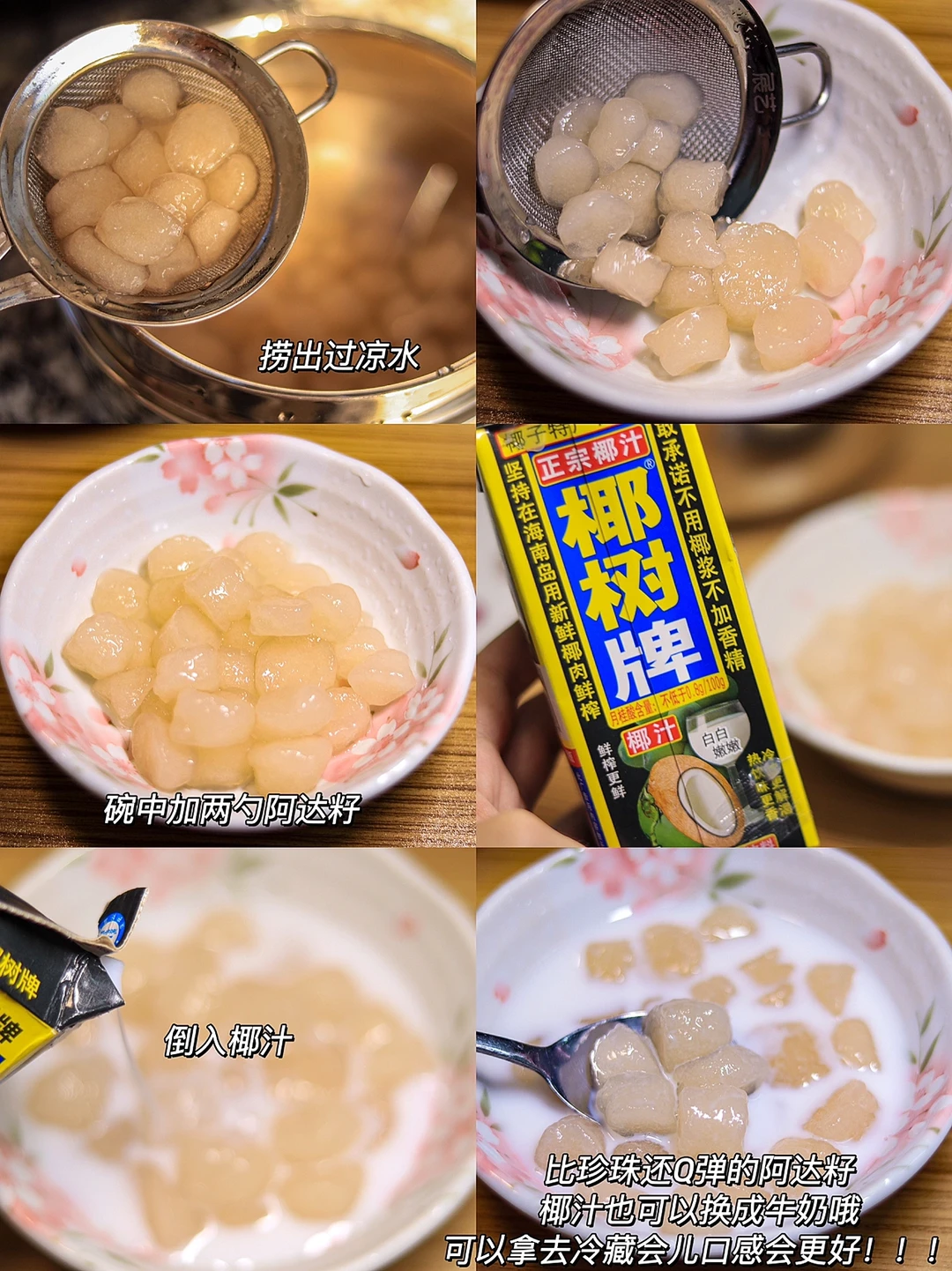 🧚♀️食材:木薯淀粉100g,开水75-80g,椰汁。 🧚♀️做法:1.100g的木薯淀粉加入开水75-80g,下手揉成团(太干就加水(看着加)太湿就加粉) 2.搓成长条切小段。 3.水煮沸后再下切好的阿达籽,(一定要煮沸)煮至半透明状态,大概20至25分钟,捞出过凉水。 4.加两勺阿达籽至碗中,倒入椰汁(或者牛奶)可以拿去冰镇一下口感会更好哦!!! 🧚♀️比珍珠还Q弹,福建闽南地区传统地方小吃,四果汤必备食材之一,超级无敌好吃[赞R][赞R][赞R]