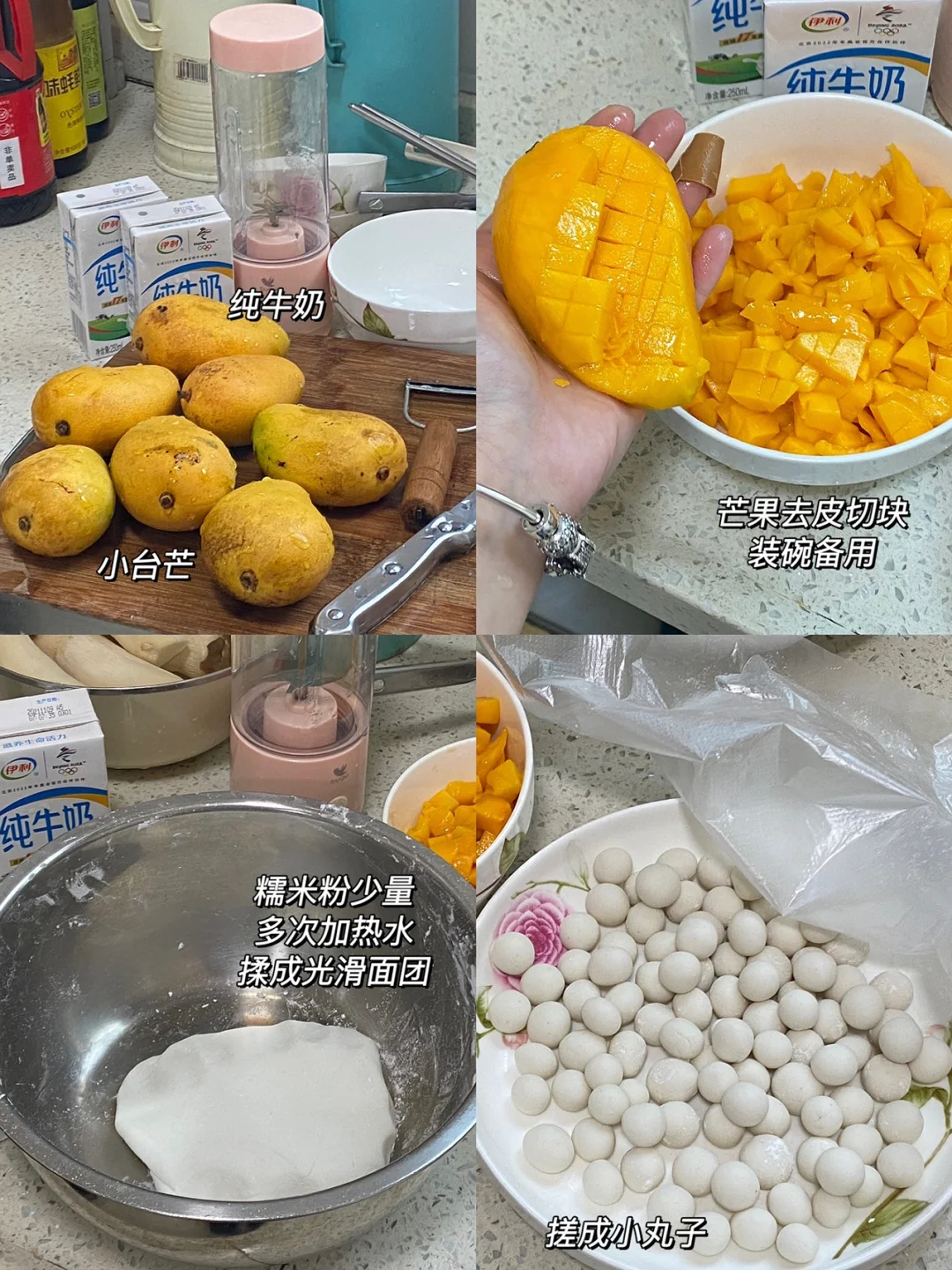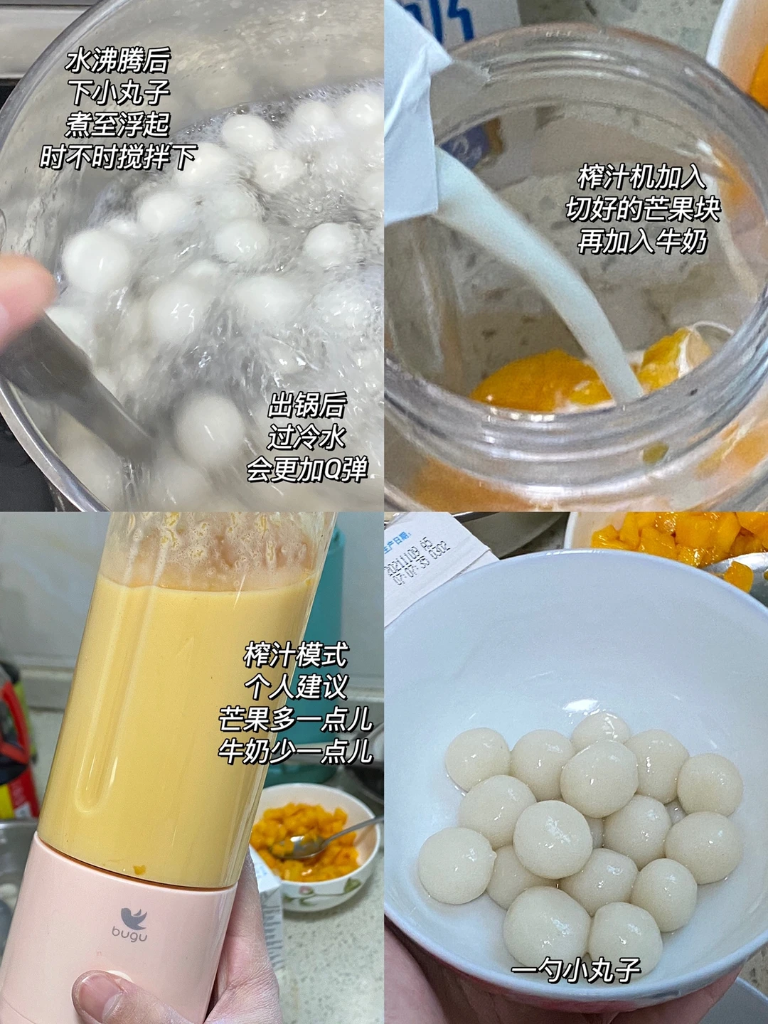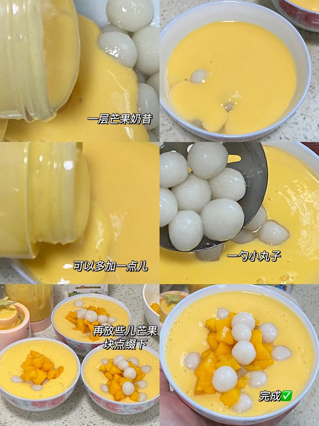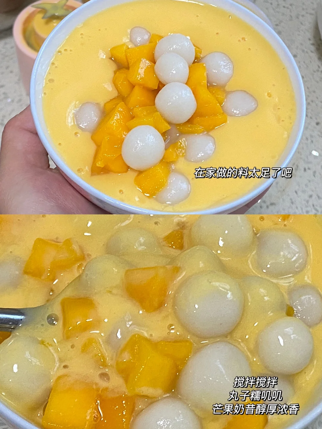 🥭食材:小台芒,糯米粉,纯牛奶。 🥭做法:1.芒果去皮切块,装碗备用。 2.糯米粉少量多次加热水,揉搓成光滑面团。 3.搓成小丸子,水沸腾后下小丸子,时不时搅拌下防止糊锅,出锅后过冷水,会更加Q弹。 4.榨汁机加入切好的芒果块,再加入牛奶,(个人建议:芒果多一点儿,牛奶少一点儿) 5.装碗:一勺小丸子,一层芒果奶昔,可以稍微多加一点儿,一勺小丸子,最后再放些芒果块点来点缀下,完成✅ 🥭搅拌搅拌,丸子糯叽叽,芒果奶昔浓厚醇香,在家做的料太足了吧[赞R][赞R][赞R]