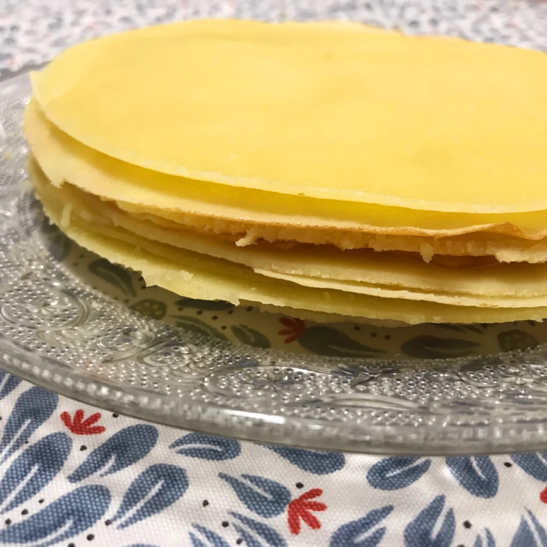 4、平底锅预热,小火,将一勺面糊放进摊开,不要太厚也不要太薄。