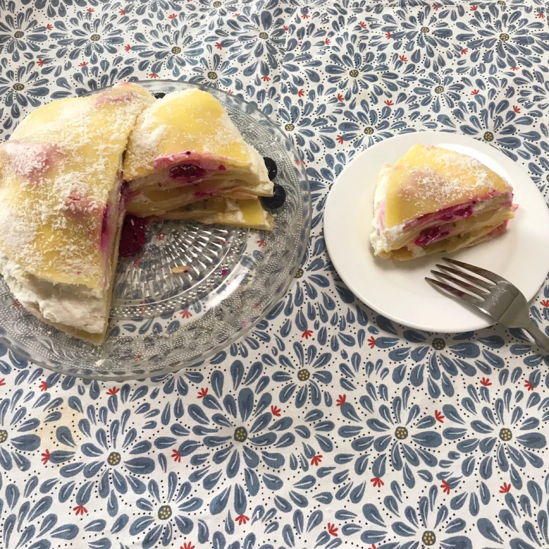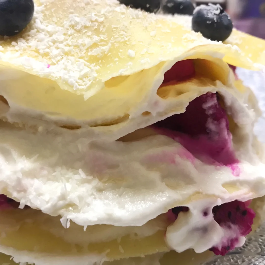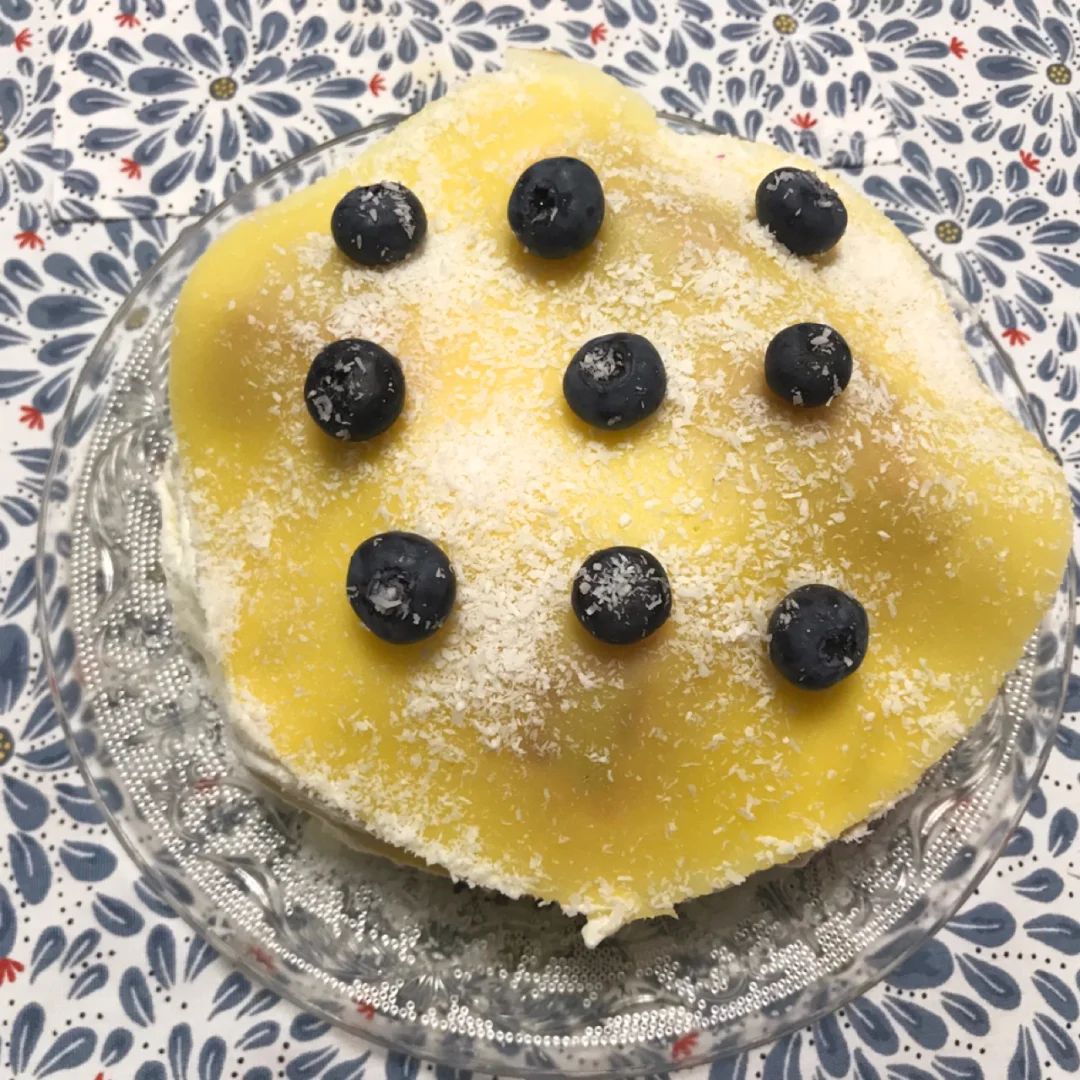 8、最后撒上糖粉,因家里只有椰蓉 蓝莓点缀,然后用保鲜膜封好放进冰箱冷藏两小时左右。