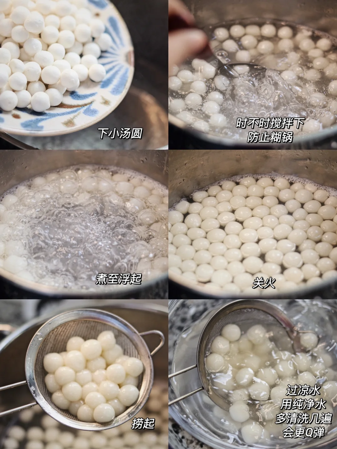 4.准备好提前搓好的小汤圆,锅中倒入清水煮沸,下小汤圆,时不时要搅拌搅拌防止糊锅,煮至浮起捞出过凉水,可用纯净水多冲几遍,汤圆会更加Q弹。
