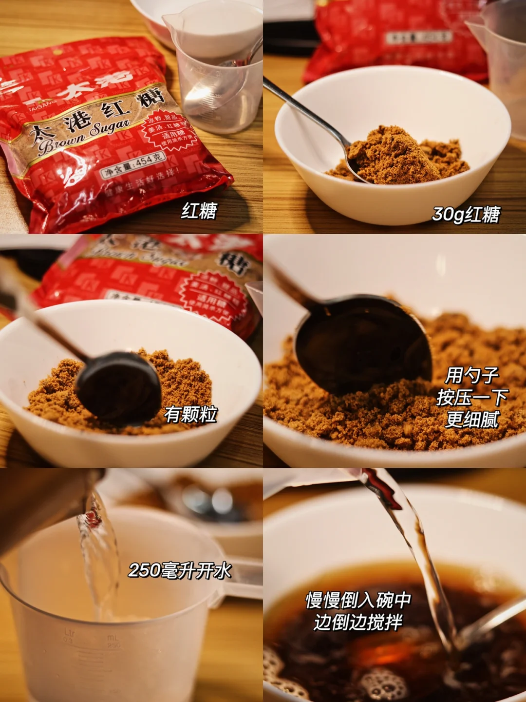 🥥做法:1.准备30克红糖,用勺子按压下更细腻。