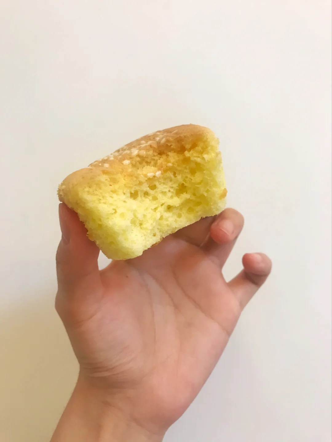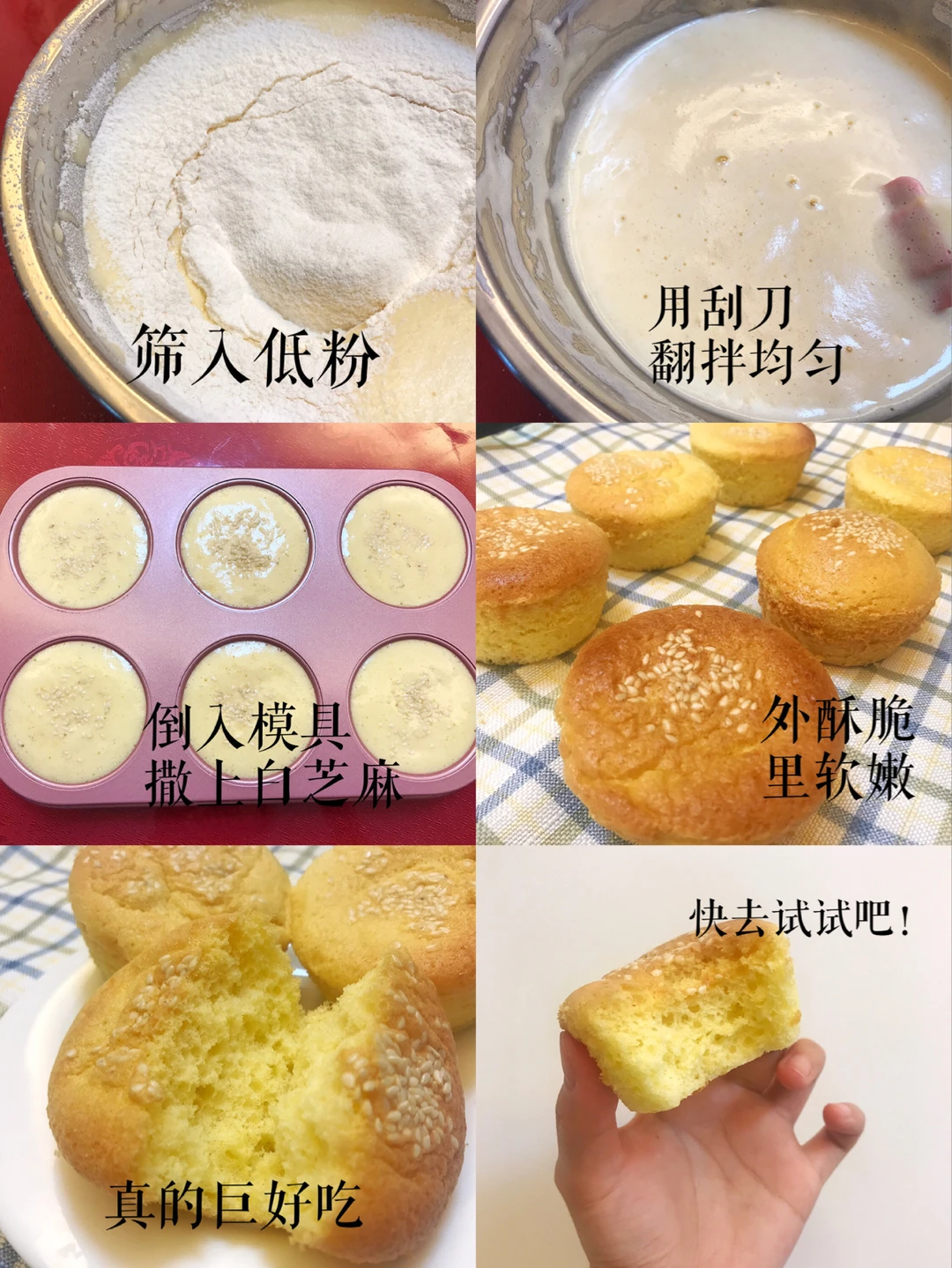 4.模具刷油,我用的是学厨马芬蛋糕模具,易脱模,所以没刷,从高处把面糊倒入模具中,撒上些白芝麻,轻震几下模具把气泡震出来。