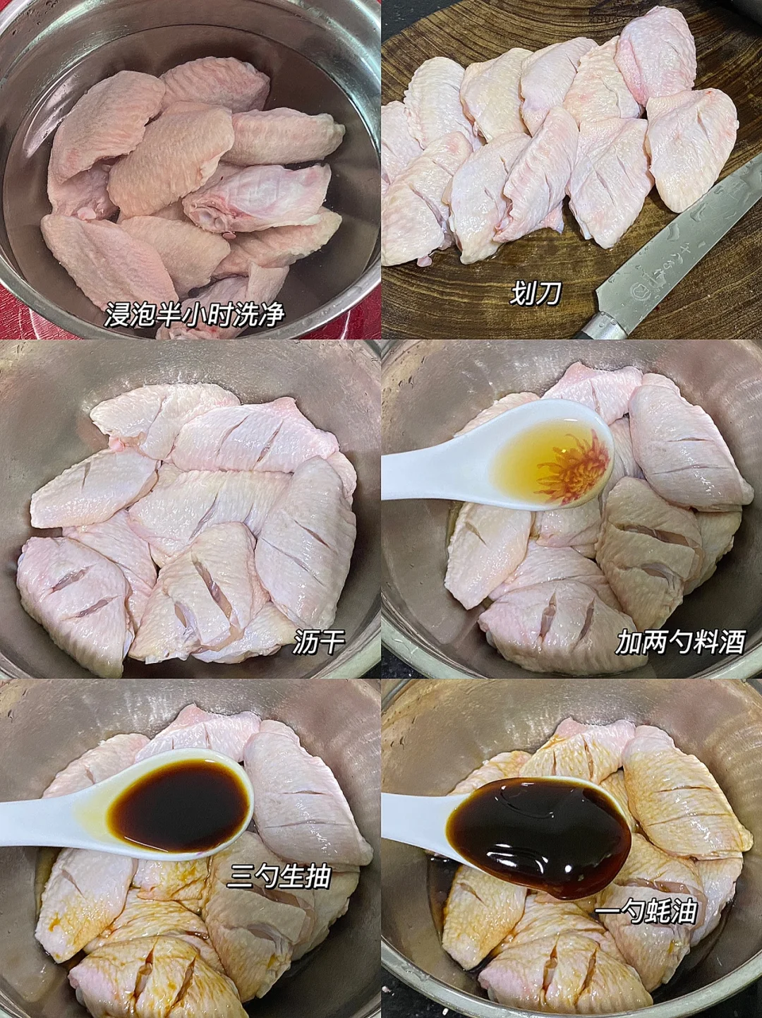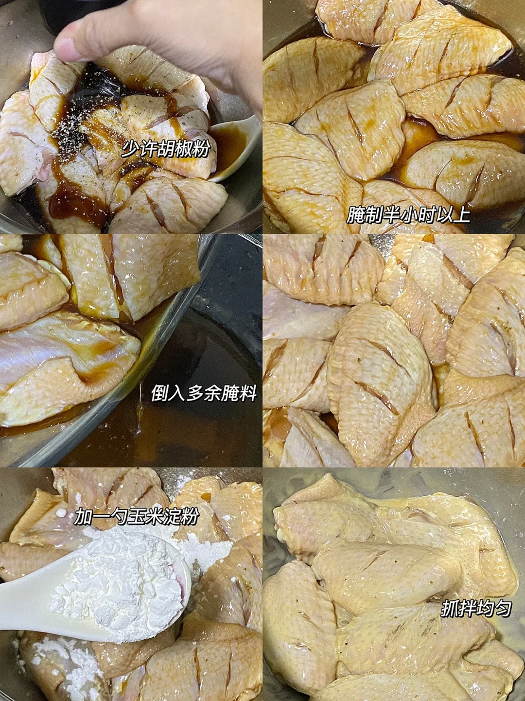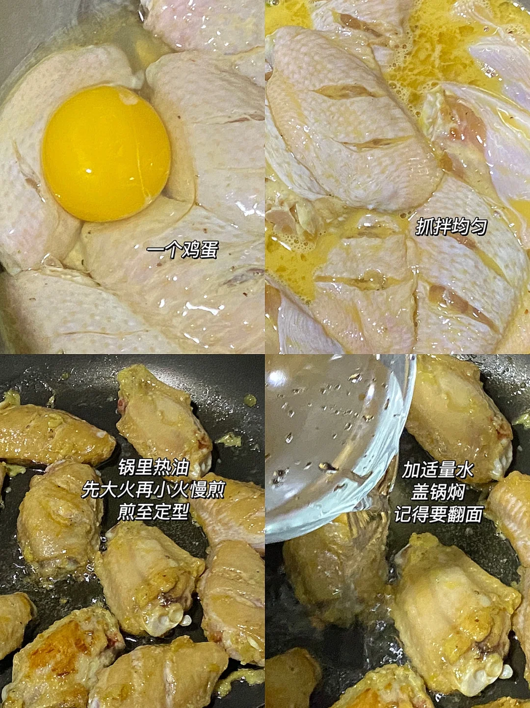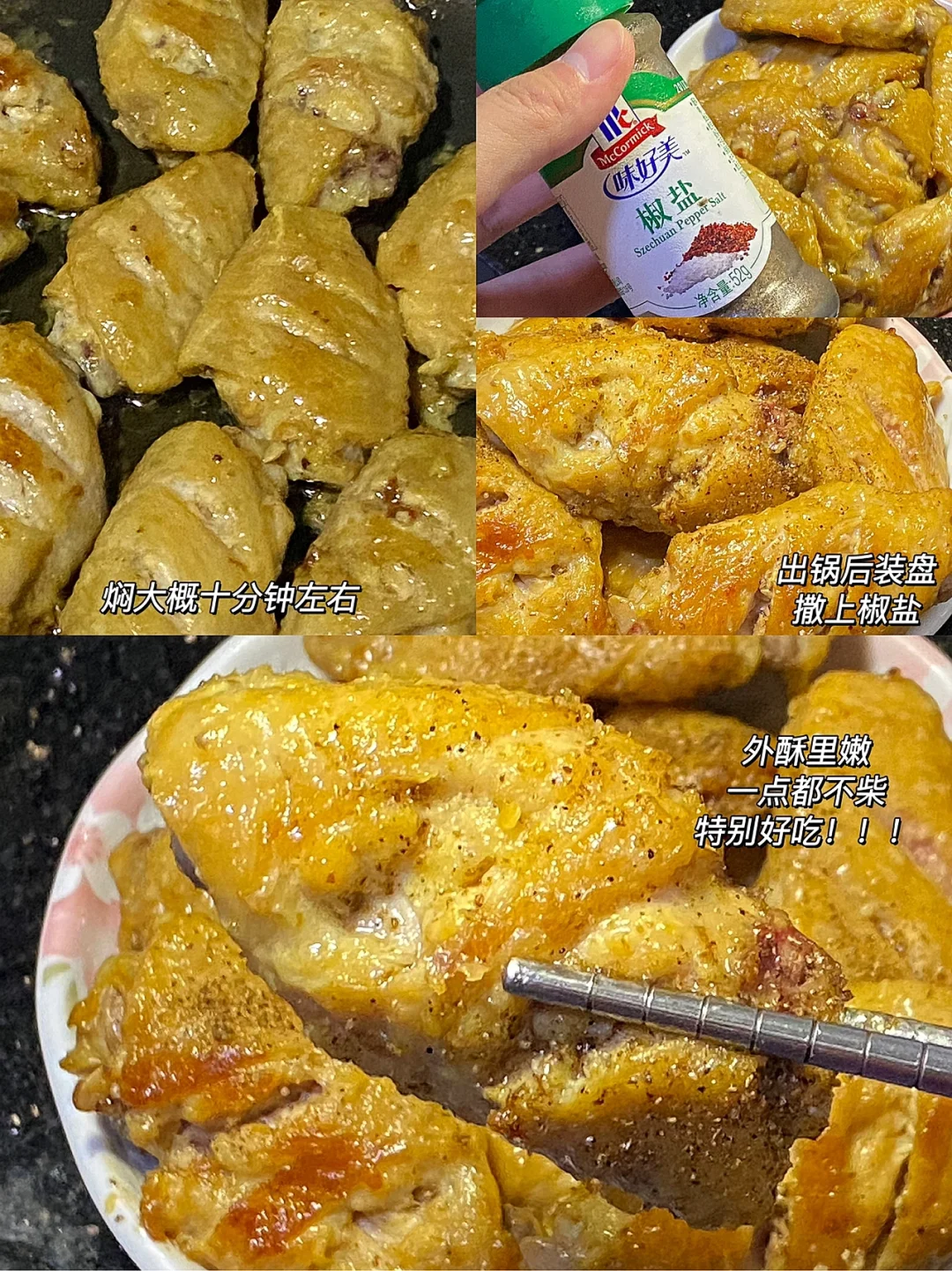 🌟食材:鸡翅,料酒,生抽,蚝油,胡椒粉,玉米淀粉,鸡蛋。 🌟做法:1.鸡翅浸泡半小时,划刀,洗净沥干。 2.加两勺料酒,三勺生抽,一勺蚝油,少许胡椒粉,腌制半小时以上。 3.倒掉多余的腌料,加一勺玉米淀粉,一个鸡蛋,抓拌均匀。 4.锅里热油,先大火再小火慢煎,煎至定型。 5.加适量水,盖锅焖,记得翻面,焖大概十分钟左右。 6.出锅后,装盘撒上椒盐,外酥里嫩,一点儿都不柴,特别好吃[赞R][赞R][赞R]
