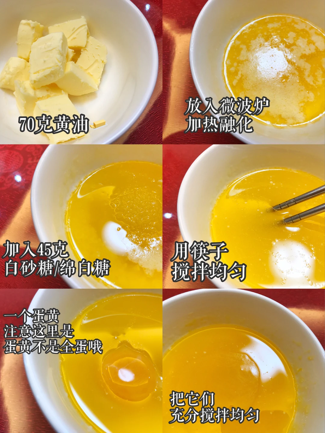 👩🍳做法:1.70克黄油🧈放入微波炉加热至融化。