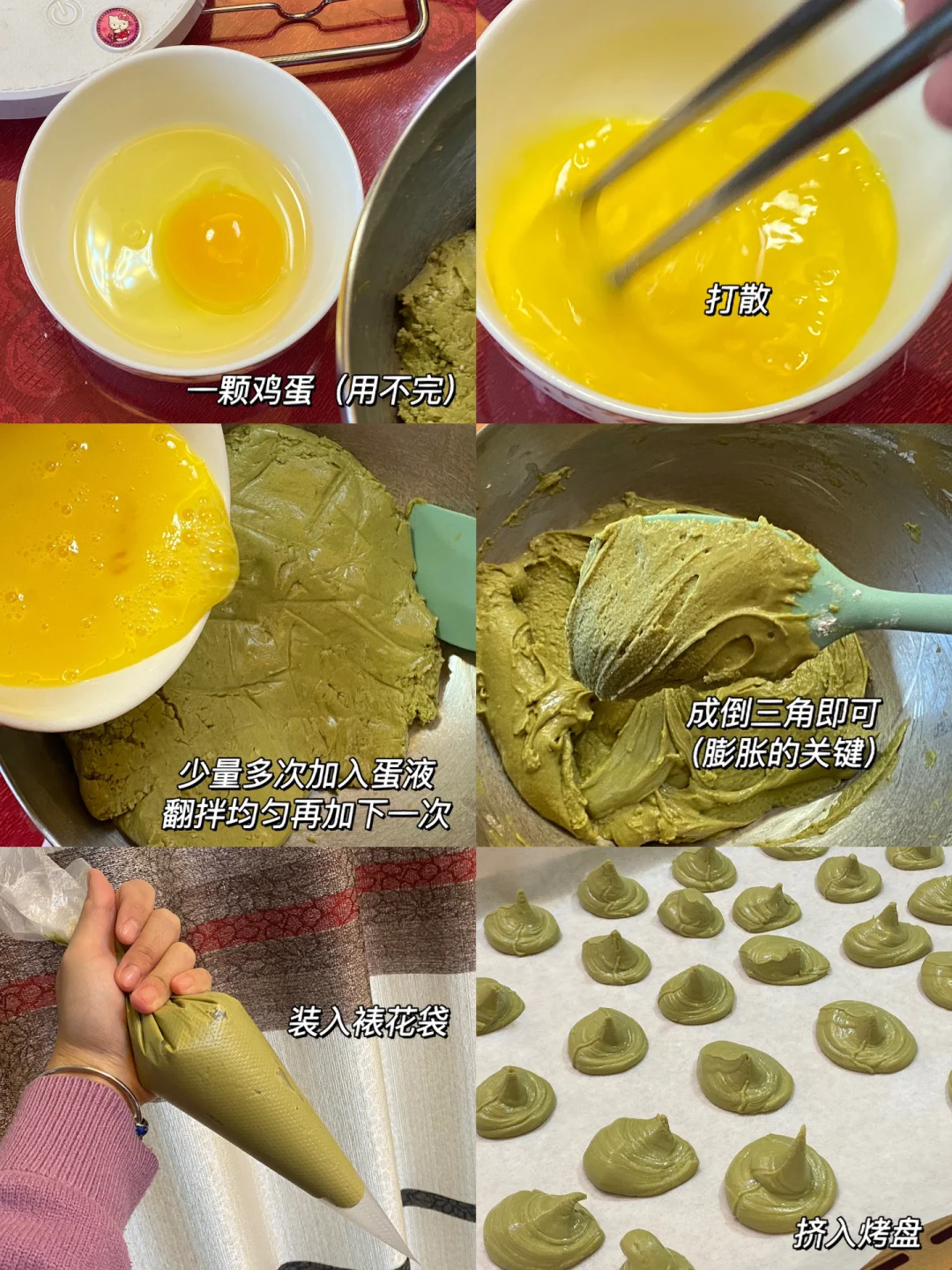 3.一颗鸡蛋打散(用不完)少量多次倒入,翻拌均匀再加下一次,成倒三角即可(膨胀的关键),装入裱花袋,挤入烤盘。