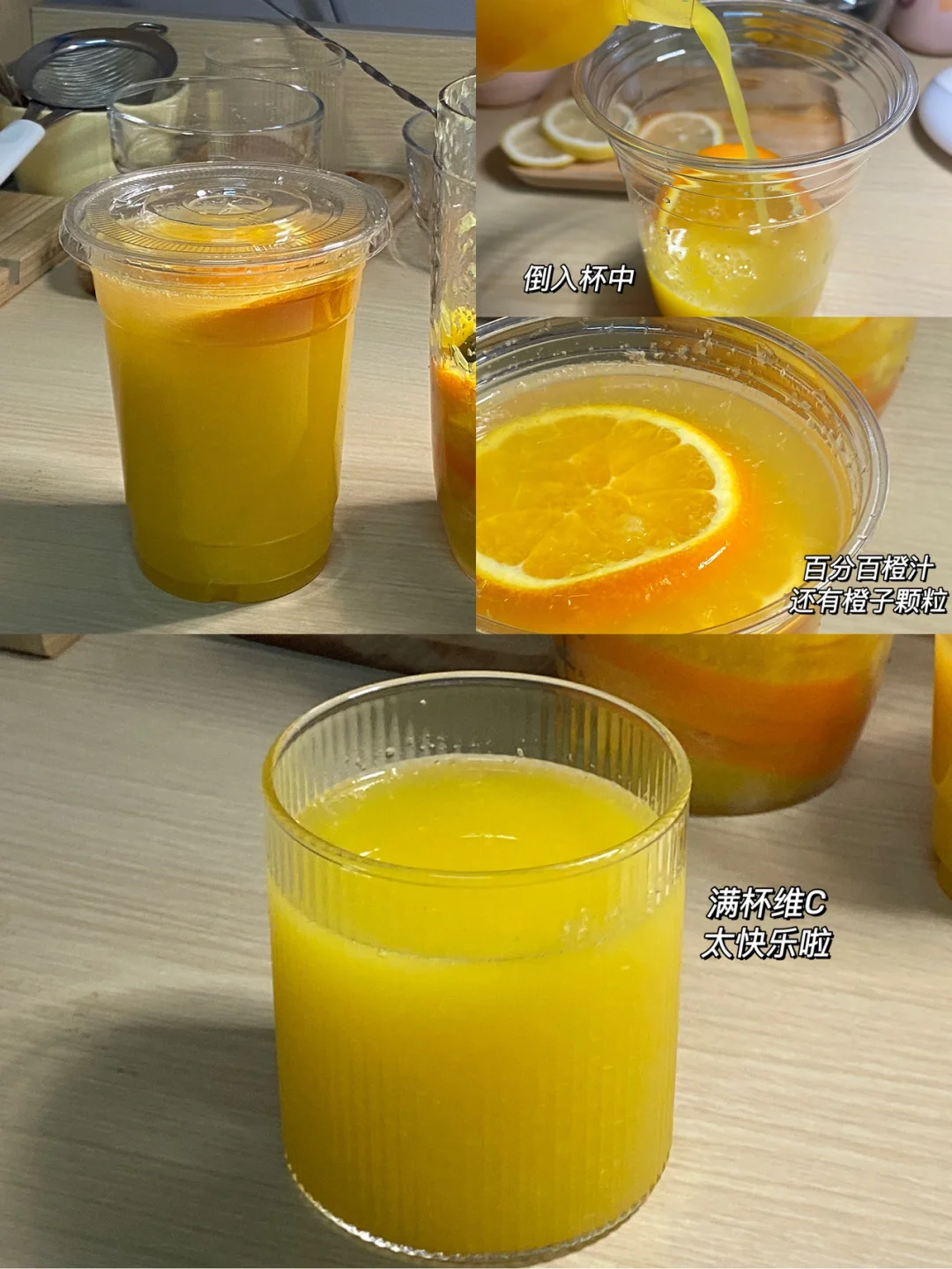 🍊食材:三个小橙子,柠檬1个,东方树叶茉莉花茶一瓶 🍊做法:1.橙子、柠檬撒上适量食盐,用盐水搓洗干净。 2.橙子、柠檬切块备用,另外一个橙子剥皮切块备用,将切好的橙子块放入榨汁机中,倒入一半的茉莉花茶,榨汁备用。 3.雪克杯放入橙子片、柠檬片捣出汁后,倒入榨好的橙汁,倒入一小杯茉莉花茶,用吧勺搅拌搅拌,盖上盖子来回搅拌搅拌。 4.一次性杯子放入两片橙子片,再倒入杯中,百分百橙汁,还有橙子颗粒。 5.满杯维C真的太快乐啦!!!