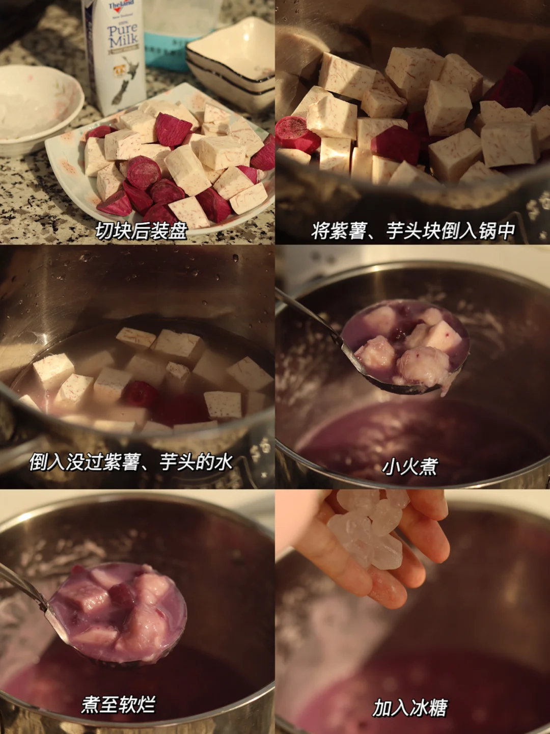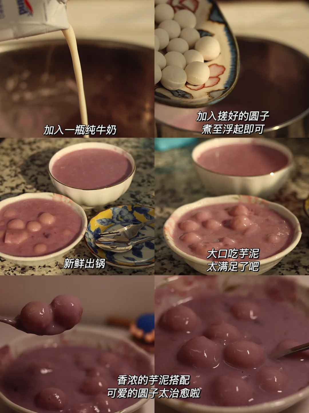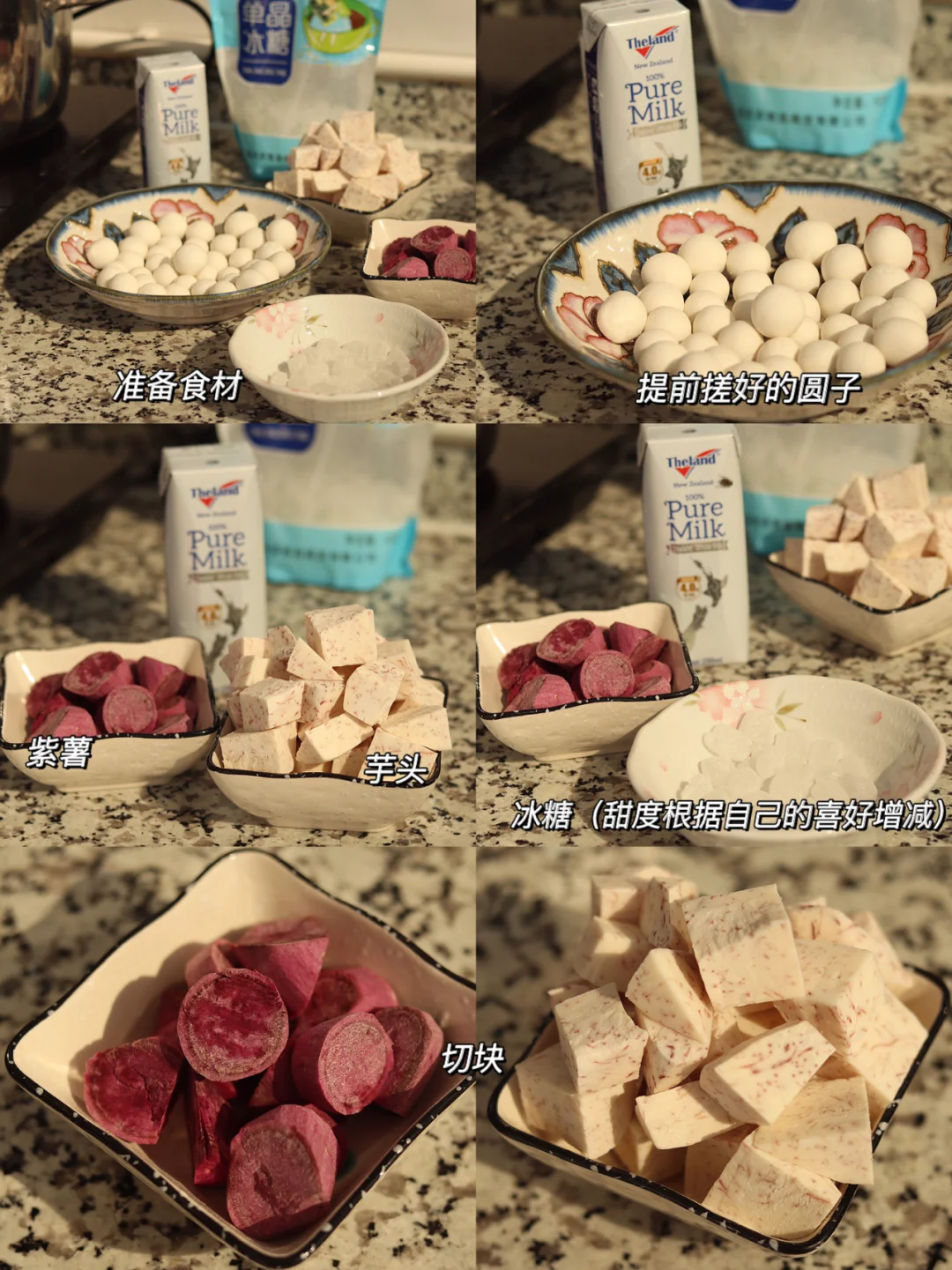 🥛食材:圆子(提前搓好)纯牛奶,冰糖,紫薯,芋头,用料没有固定的哦,根据自己的喜好增减。