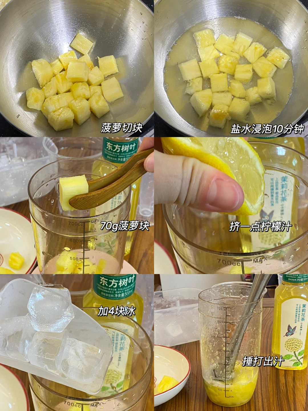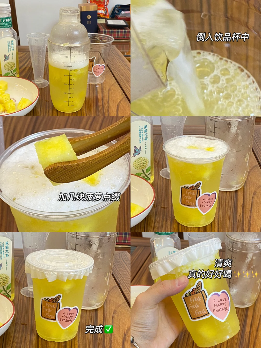 🍍食材:菠萝果肉70g,柠檬汁适量,冰块,茉莉花茶250ml,自制糖浆30ml。 🍍做法:1.菠萝切块,盐水浸泡10分钟。 2.70g菠萝块、冰块放入雪克杯中,挤一点柠檬汁,锤打出汁。 3.倒入糖浆、茉莉花茶,加冰至500ml刻度线,雪克一下!!! 4.倒入饮品杯中,加一两块菠萝点缀一下,完成✅ 🍍清爽好喝!!!赶紧试试吧[赞R][赞R][赞R]