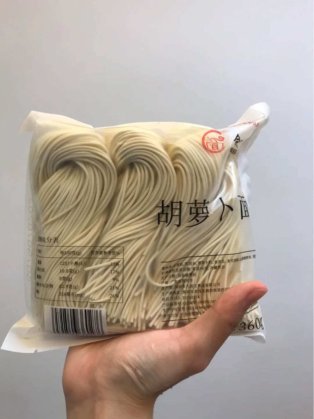 6.面的话用新鲜面的细面条,我用的是超市买的胡萝卜面,水开后放入面条,煮开后加半杯冷水,煮开之后再加一次,再次煮开的时候就可以啦!