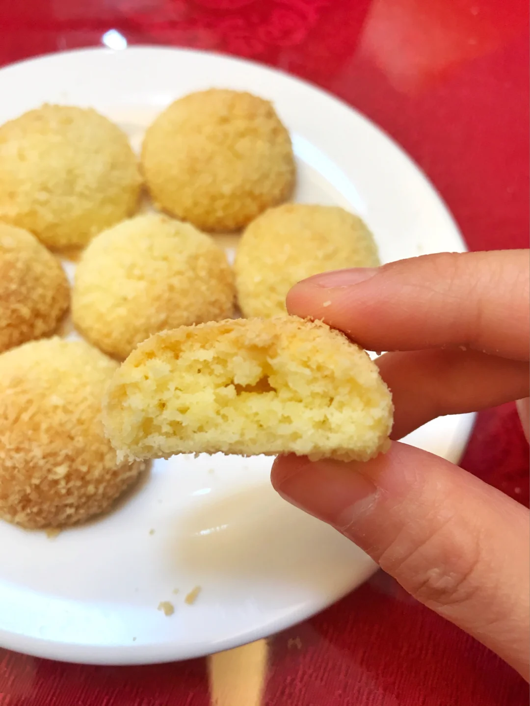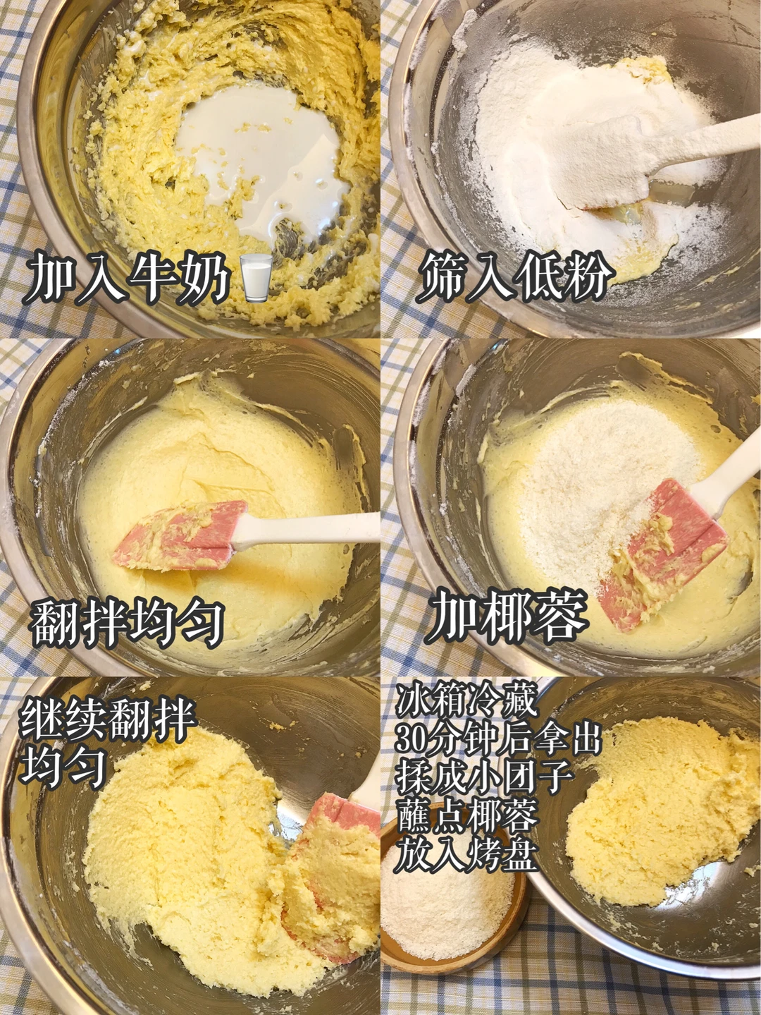 对椰蓉那真的是太爱辽!!!儿时的味道鸭🥰 🥥食材:黄油🧈60克,细砂糖30克,蛋黄1个,椰蓉90克,低粉40克,牛奶🥛25克。 🥥做法:1.黄油🧈室温软化,打发至体积变大颜色发白。 2.加入细砂糖,继续打发一分钟。 3.加入一个蛋黄,继续打发。 4.加入牛奶,筛入低粉,翻拌均匀。 5.加椰蓉,继续翻拌均匀。 6.冰箱冷藏30分钟后拿出,揉成小团子,裹点椰蓉,放入烤盘。 7.烤箱提前预热,180度烤制20分钟,颜色金黄即可。 🥥尝一口,椰奶香浓郁,唇齿留香,回味无穷🥰