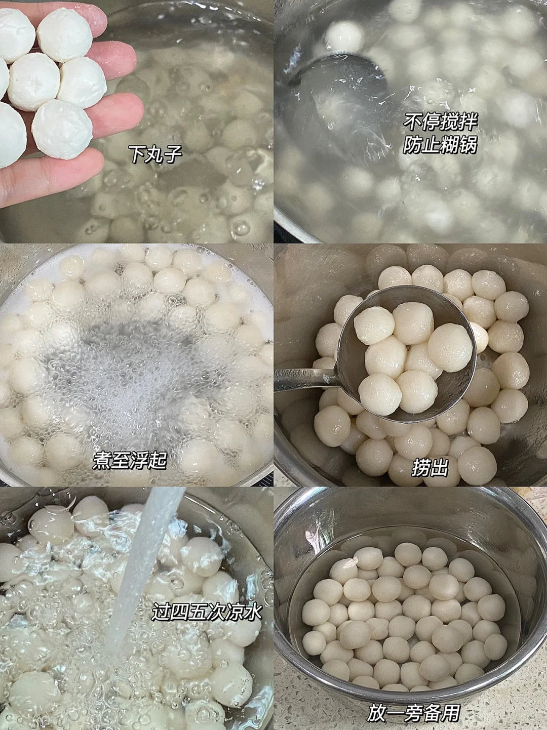 3.水煮开,下丸子,不停搅拌,防止糊锅,煮至浮起,捞出过四五次凉水,放一旁备用。