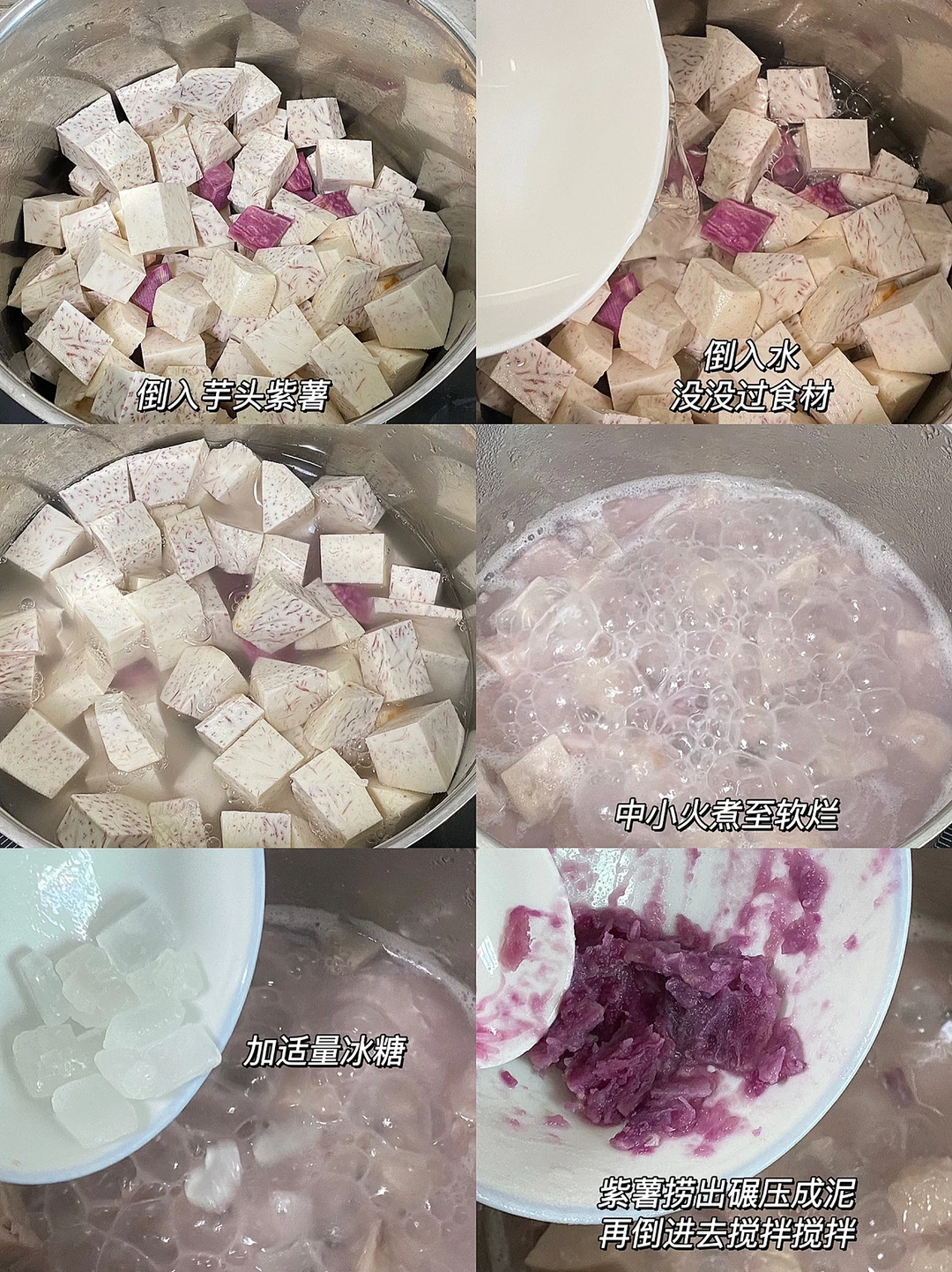 4.倒入芋头紫薯,倒入水没没过食材,中小火煮至软烂,加适量冰糖。
