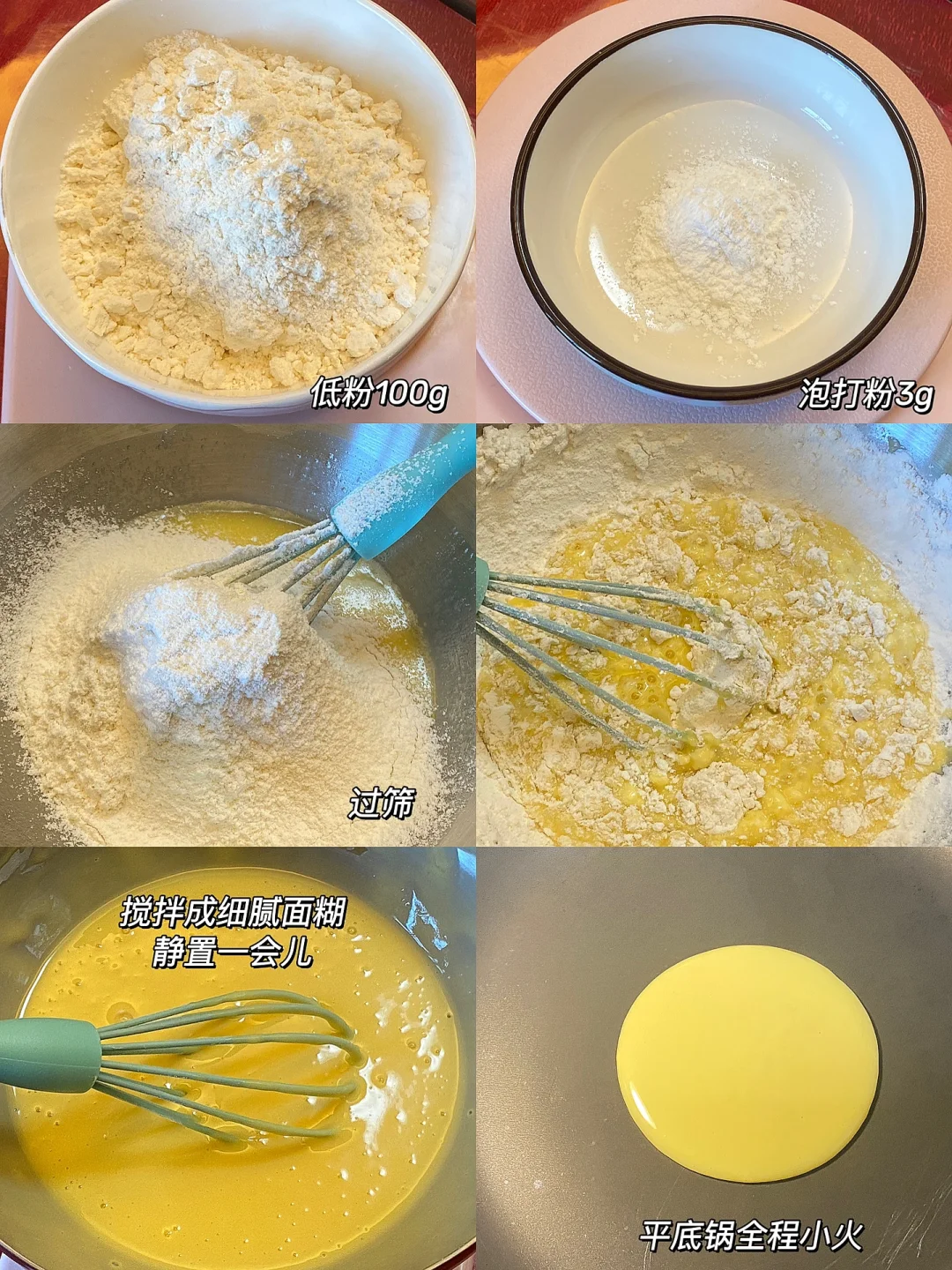 🥞建议:准备一个小湿布,每煎完一片都可以让湿布降降温,会发出滋滋的声音,等降温后再继续煎下一片(不要嫌麻烦,这一步可以使每一片都光滑,上色也会比较均匀,一定要有耐心哦!!!)
