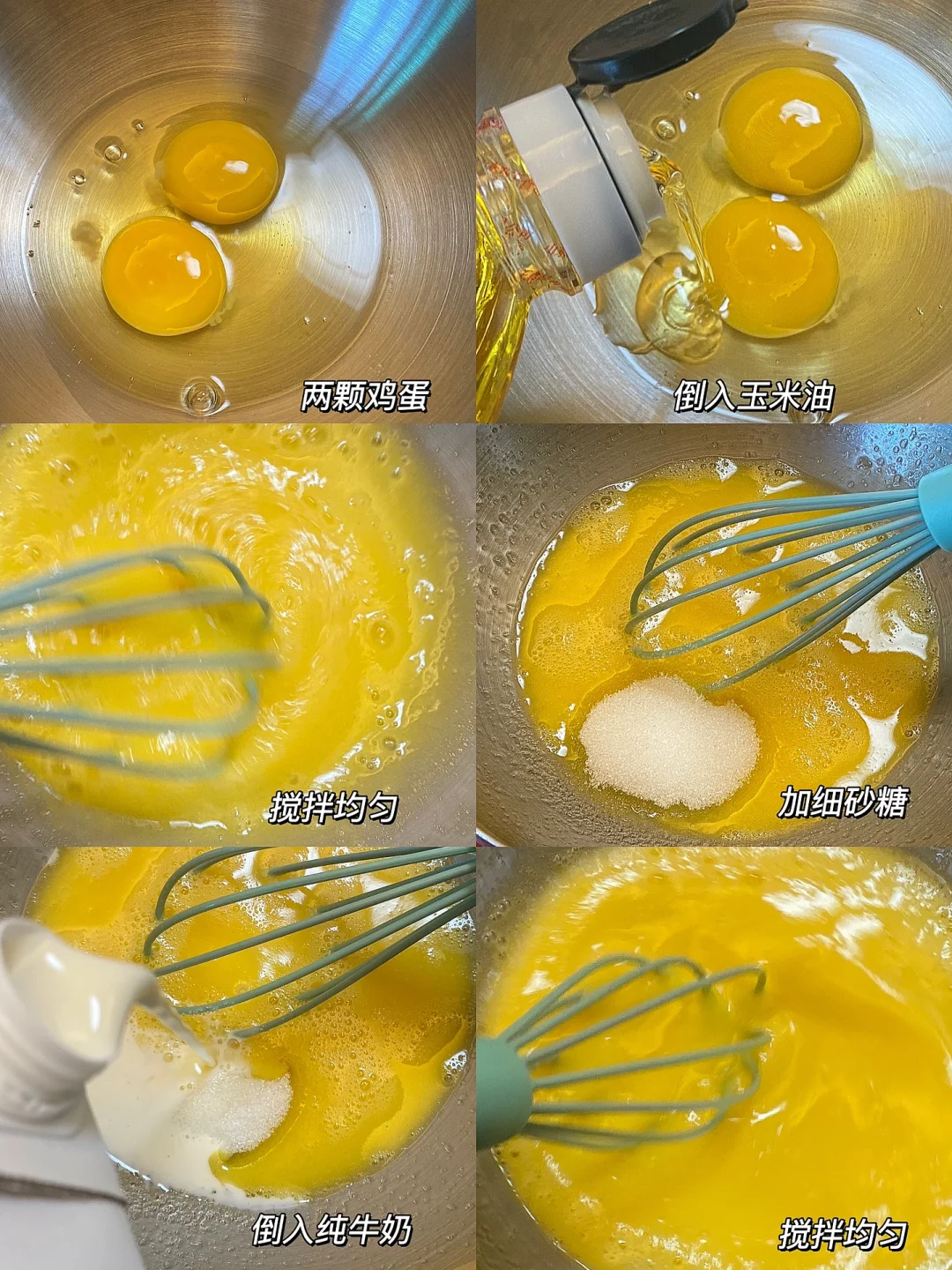 🥞做法:1.将两颗鸡蛋打入无水无油的大盆中,加玉米油,搅拌均匀,加细砂糖,倒入牛奶,搅拌均匀。