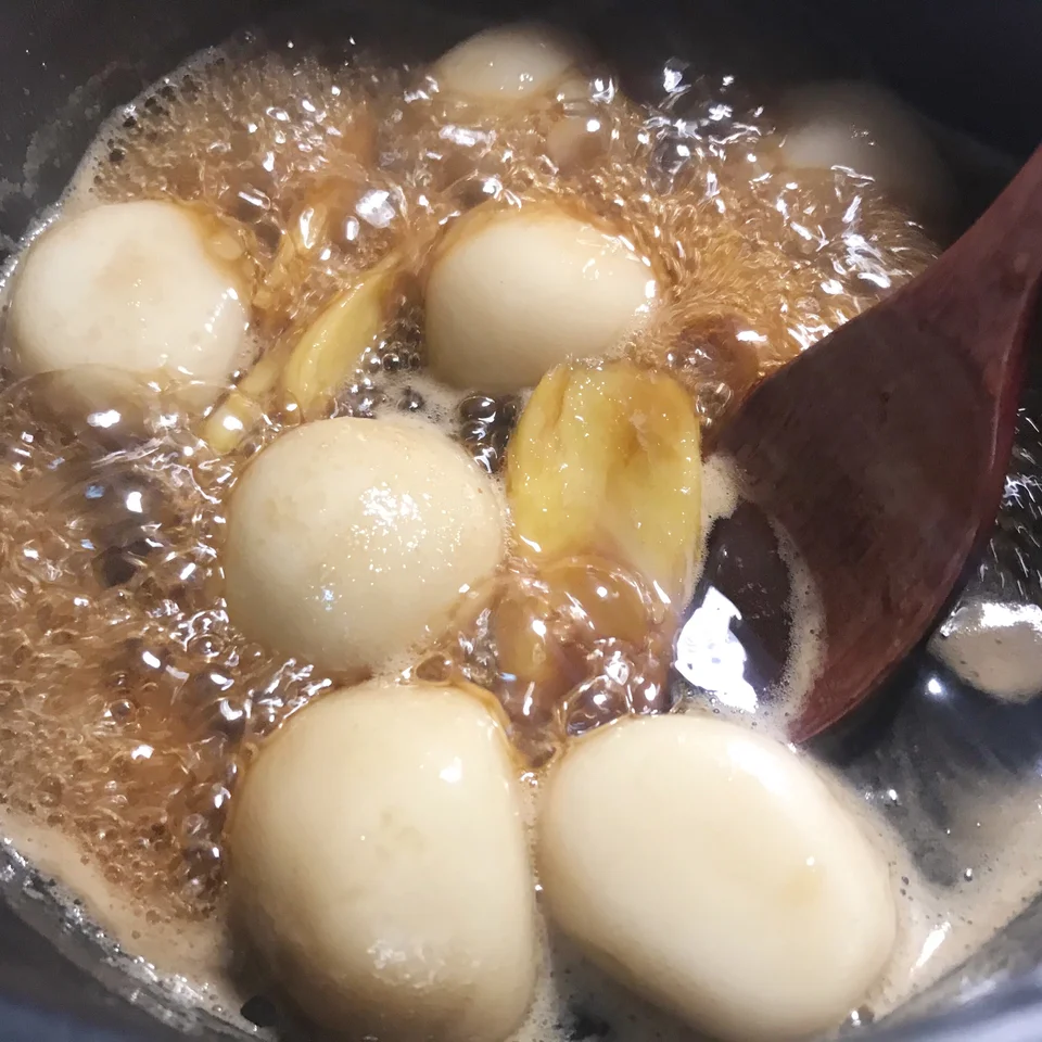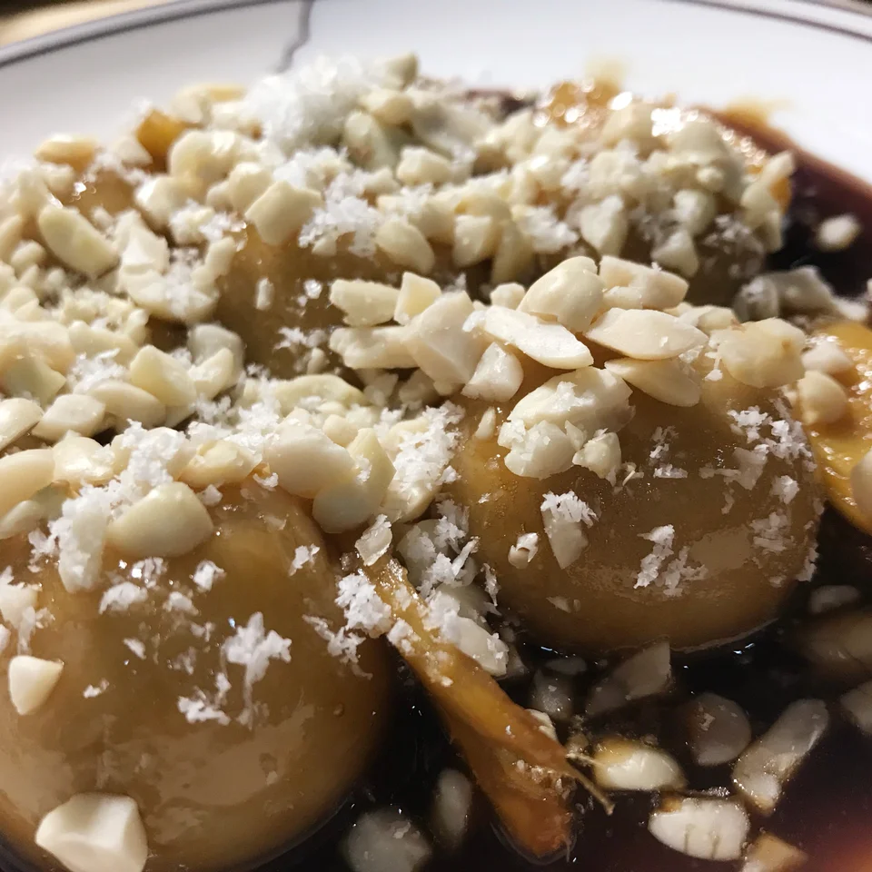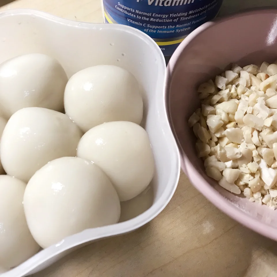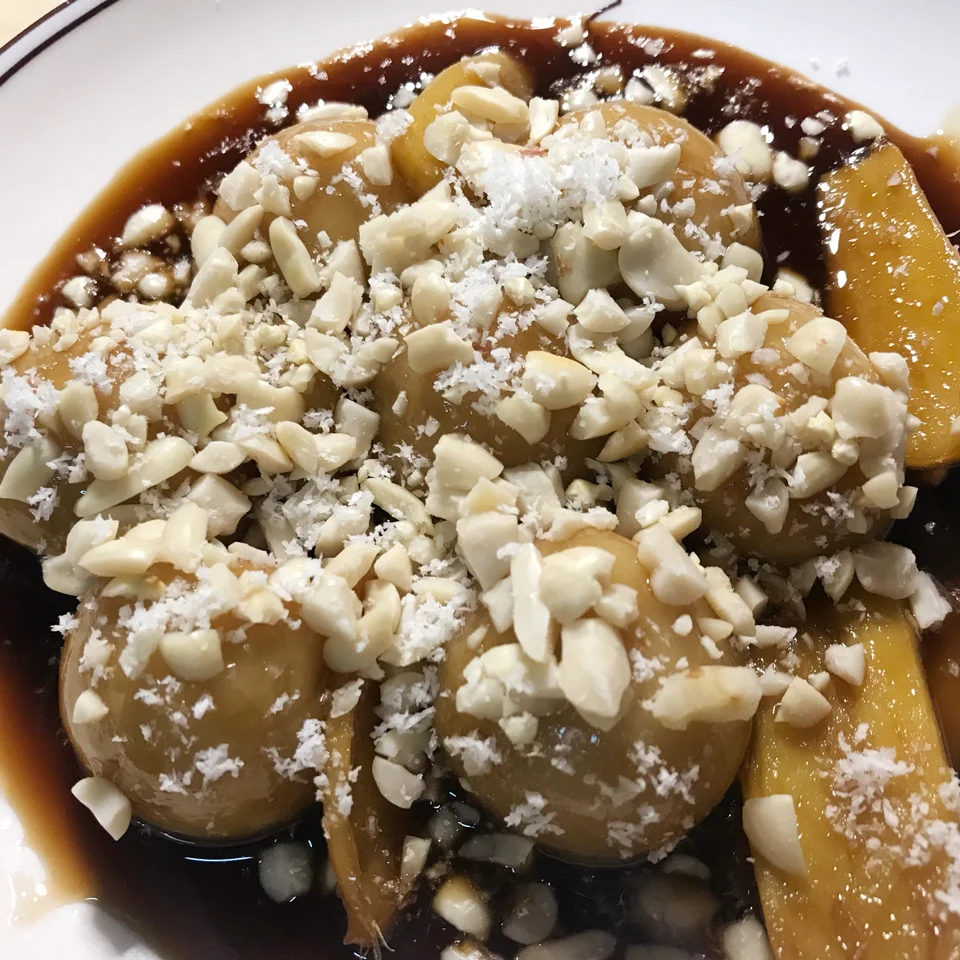 食材:花生米适量、糯米粉100、温水80克、红糖适量(也可用片装)、冰糖适量、生姜两片、椰蓉适量。 做法:先将花生米放入锅中翻炒至噼里啪啦的声音,之后剥皮,放入100克的糯米粉加入温水(加入温水的时候得慢慢加,不要一次性全部加入,戴上一次性手套慢慢搓成糯米团)之后搓成一个个圆子(也可大点)放入锅中煮透,当小圆子浮起来就熟透了,再将剥好皮的花生碾压碎,把煮透的圆子捞出,放入红糖姜片冰糖煮至粘稠,然后放入圆子煮至上色后捞出装盘,撒上花生碎与椰蓉,一款暖胃的甜品就做好啦,赶快行动起来吧!😋