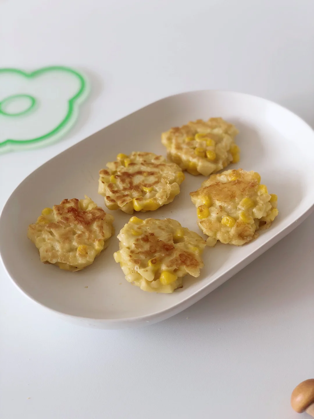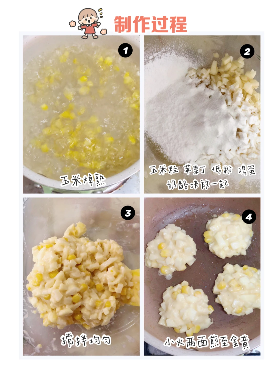 [色色R]苹果玉米奶酪饼,甜甜的玉米和苹果配上奶香味十足的奶酪,相信不会有宝宝不爱的,制作方法非常简单,学起来吧[斜眼R] 🎀准备材料:苹果、玉米粒、鸡蛋、奶酪、低筋面粉 ⬇️制作方法⬇️ 🎈玉米粒焯水,苹果去皮切小丁、奶酪切小丁. 🎈把苹果 、玉米、奶酪、低筋面粉、一个鸡蛋所有的材料放一起搅拌均匀. 🎈锅中刷油,油热后依次倒入糊糊两面煎至金黄、煎熟即可. 🌟这道辅食对食材的量要求没那么严格,像苹果,玉米多点 少点都是可以哒[斜眼R]