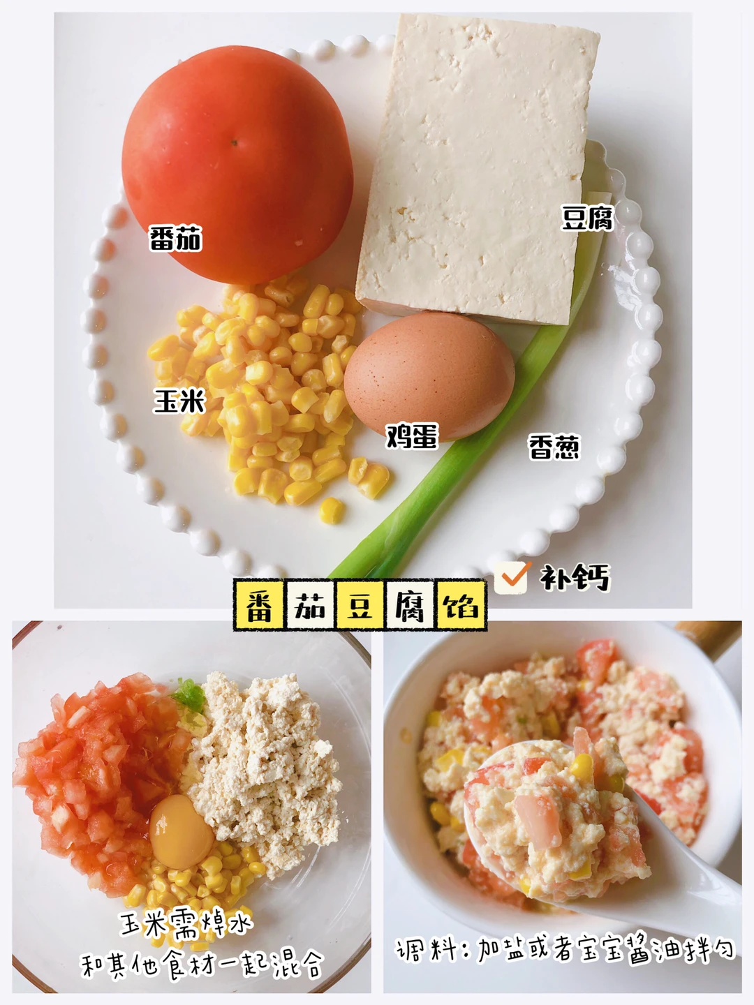 🎀准备食材:番茄、玉米、豆腐、鸡蛋、香葱 💡(番茄切碎后会有很多汤汁, 拌馅料的时候控干汁水)