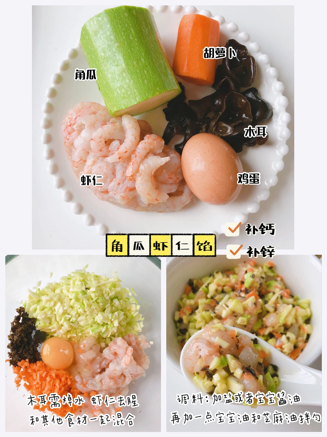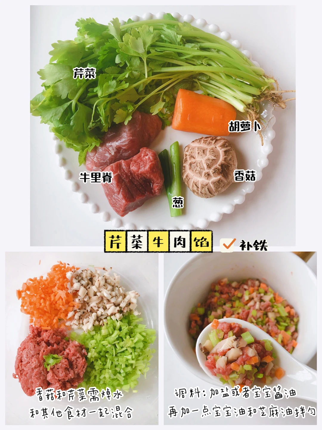🎀准备食材:角瓜、虾仁、胡萝卜、木耳、鸡蛋 3️⃣芹菜牛肉馅