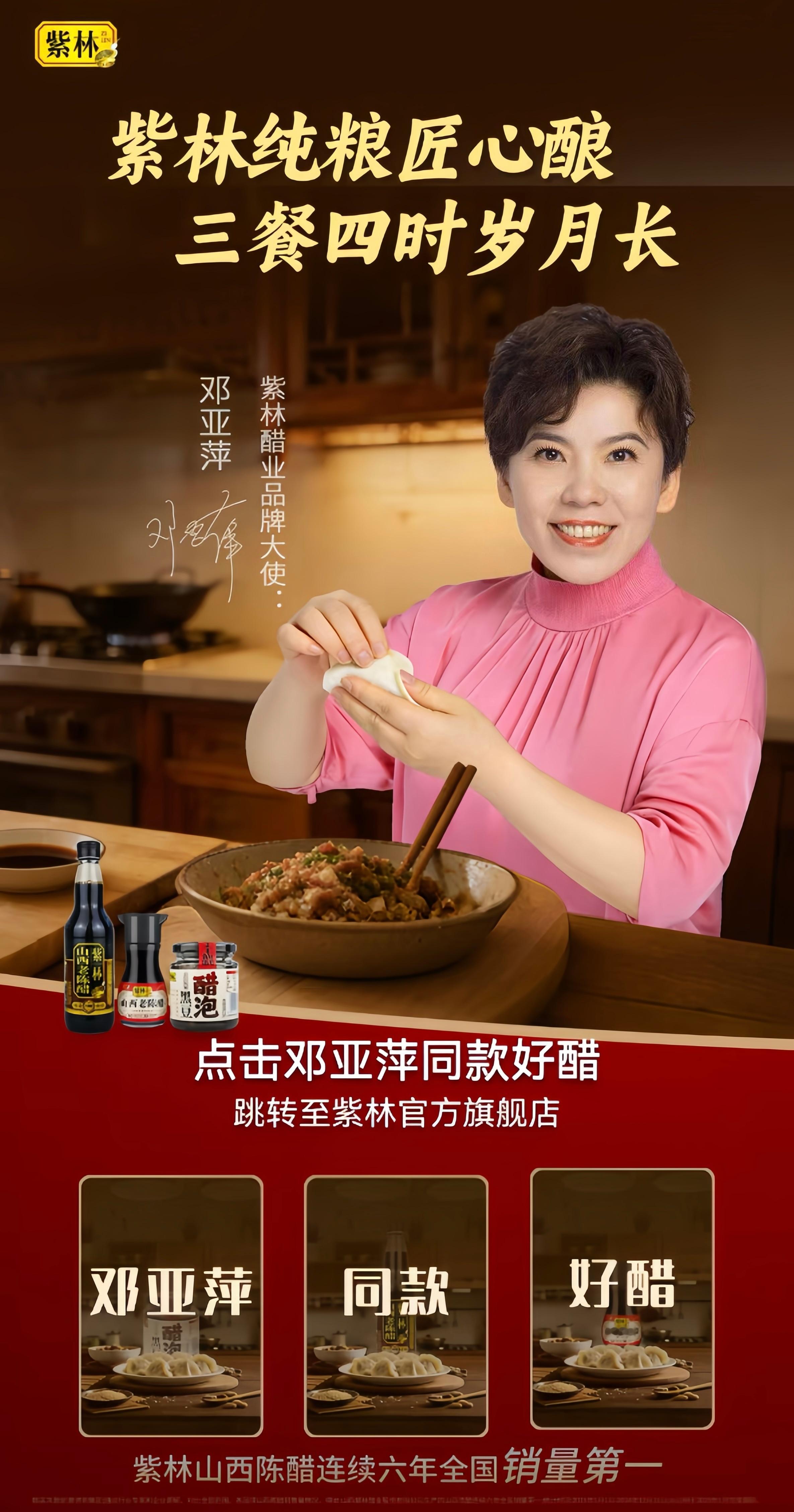 邓亚萍的心选好味 冬至吃饺子的仪式感,一半藏在团圆热闹里,一半得靠好醋来提味!今天真的超惊喜,看到邓亚萍老师发包饺子vlog,还官宣了和紫林的合作。赛场上她凭不服输的拼劲拿了无数冠军,对自己要求超严格;冬至团圆日,选瓶好醋是餐桌小讲究,她挑调料也一点不含糊。这份刻在骨子里的极致追求,让她成为乒乓传奇,也让她一眼看中踏实做品质的紫林,乒乓传奇和民族品牌的牵手,在冬至烟火气里显得格外契合。紫林老陈醋真让人放心,精选红高粱、大麦纯粮原料,经“蒸、酵、熏、淋、陈”五道古法,夏伏晒、冬捞冰陈酿一年以上,酸香绵甜鲜,蘸饺子中和油腻,一口下去超开胃。乒乓传奇的拼搏精神,遇上民族品牌实打实的品质坚守,这波双向奔赴太可了!以后家里蘸料就认准紫林,跟着邓亚萍老师选准没错~ 邓亚萍官宣紫林品牌大使