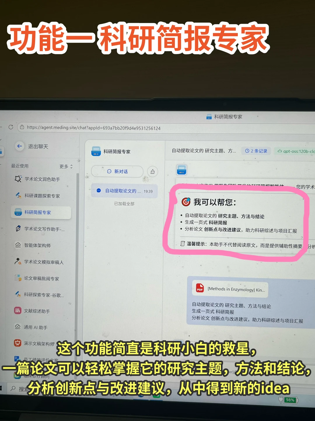 这个功能简直是科研小白的救星,一篇论文可以轻松掌握它的研究主题,方法和结论,分析创新点与改进建议,从中得到新的idea,再也不怕导师突然塞我论文了