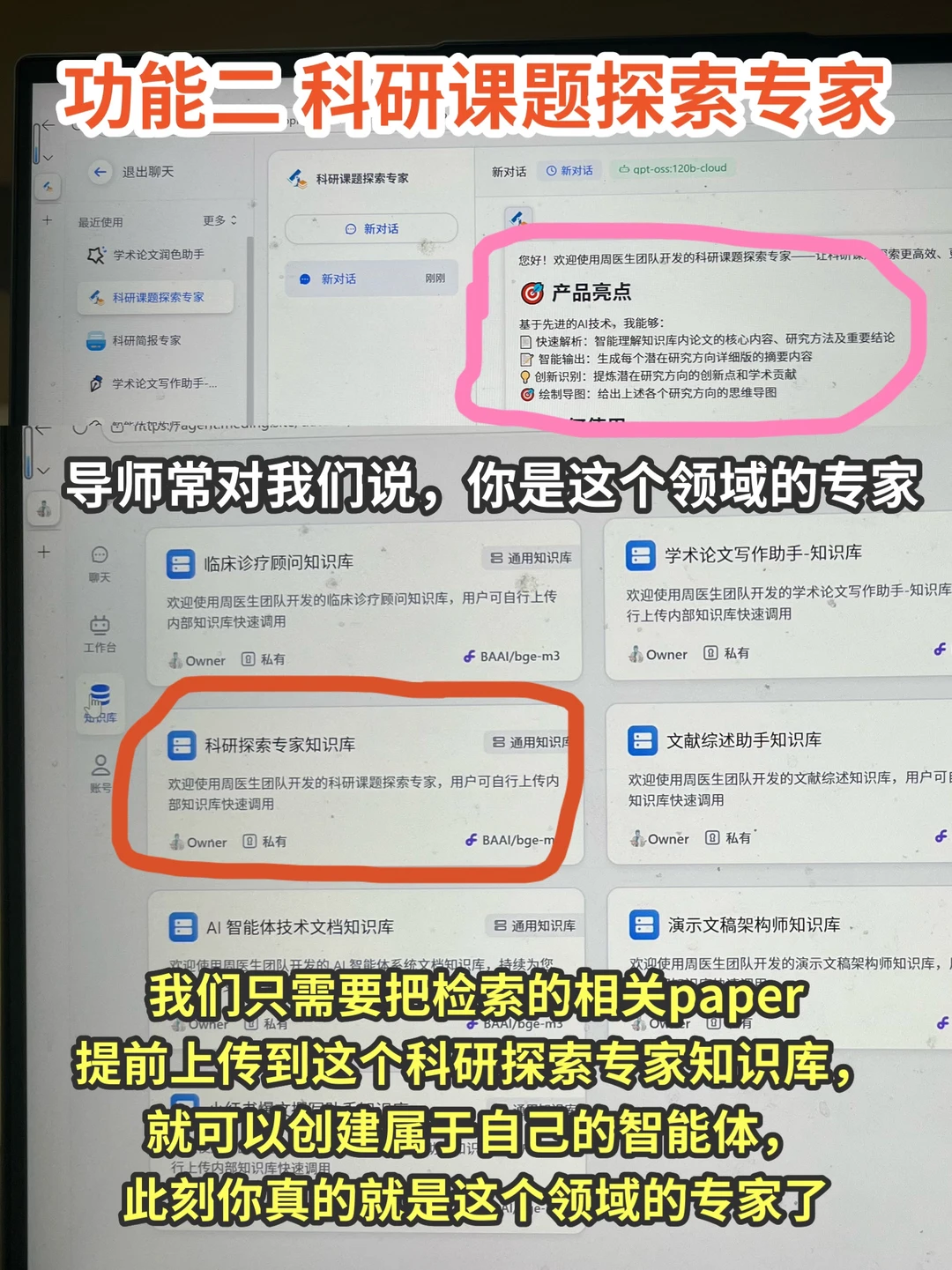 我们只需要把检索的相关paper提前上传到这个科研探索专家知识库,就可以创建属于自己的智能体,此刻你真的就是这个领域的专家了