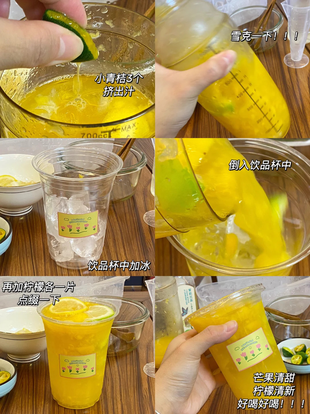 🥭食材:芒果,香水柠檬,黄柠檬,小青桔,茉莉花茶,自制糖浆,冰块。 🥭做法:1.雪克杯中放入芒果果肉,香水柠檬,黄柠檬各两片,加少量冰块,锤打出汁。 2.茉莉花茶200ml,自制糖浆20ml,小青桔3个挤出汁雪克一下! 3.饮品杯中加冰,倒入柠檬茶,再加柠檬片点缀一下。 🥭芒果清甜,柠檬清新,好喝好喝[派对R][派对R][派对R]
