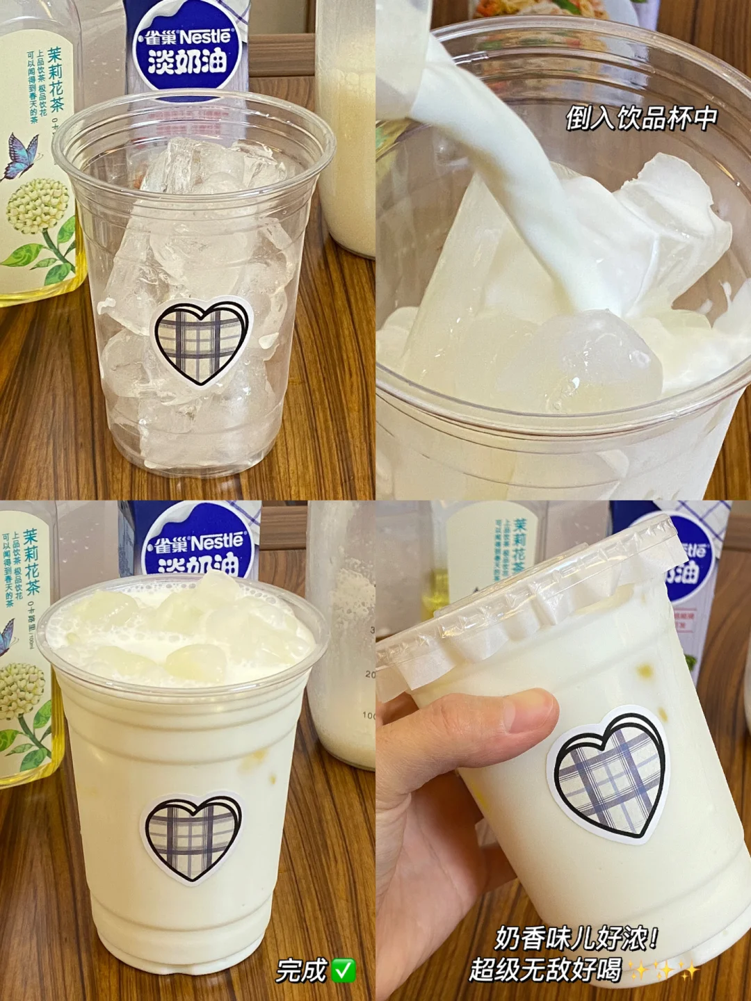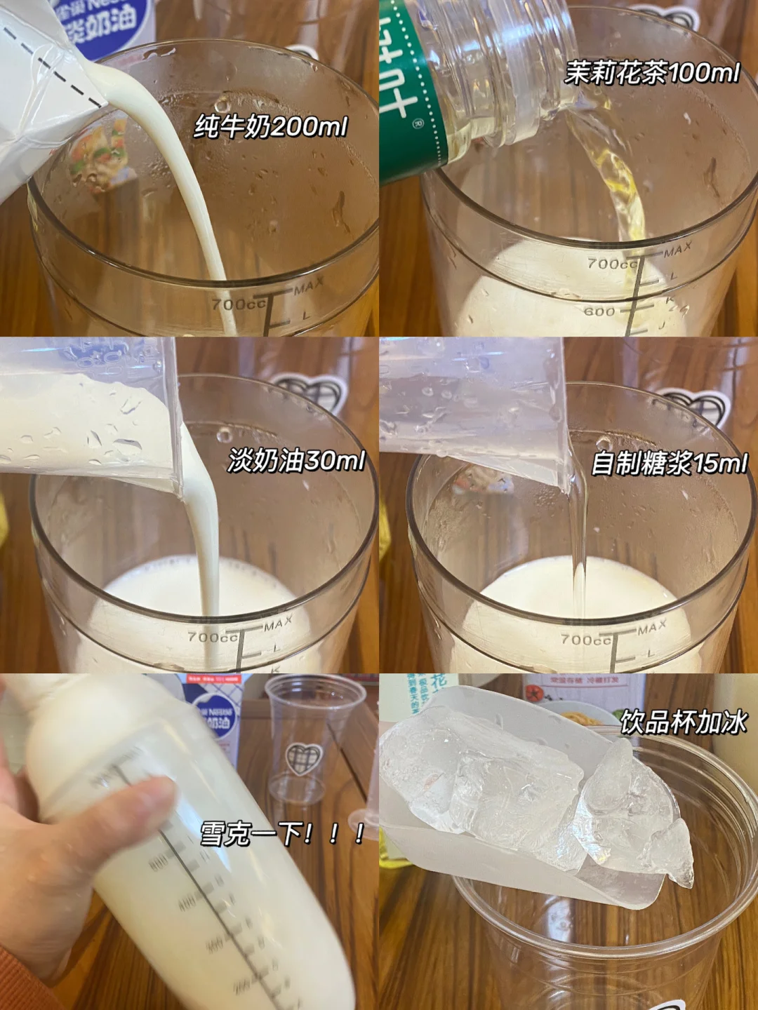 🌼食材:纯牛奶200ml,茉莉花茶100ml,淡奶油30ml自制糖浆15ml,冰块。 🌼做法:1.雪克杯中倒入纯牛奶、茉莉花茶、淡奶油、自制糖浆,雪克雪克!!! 2.饮品杯中加冰,倒入饮品杯中,完成✅ 🌼奶香味儿好浓,超级无敌好喝[赞R][赞R][赞R]