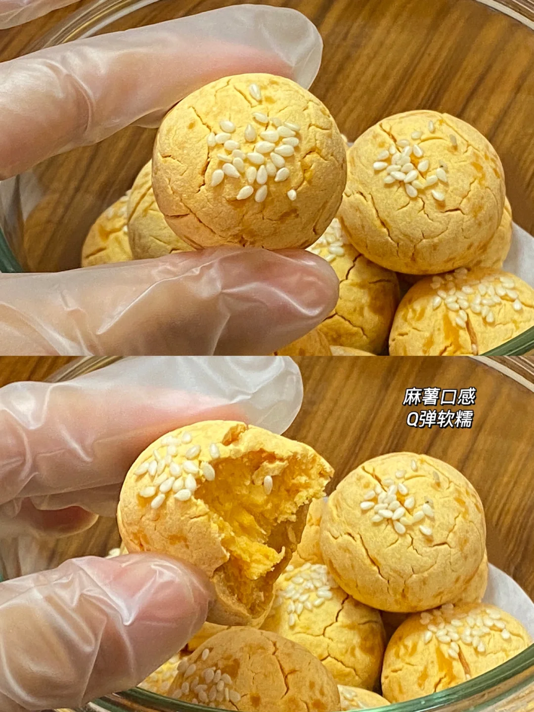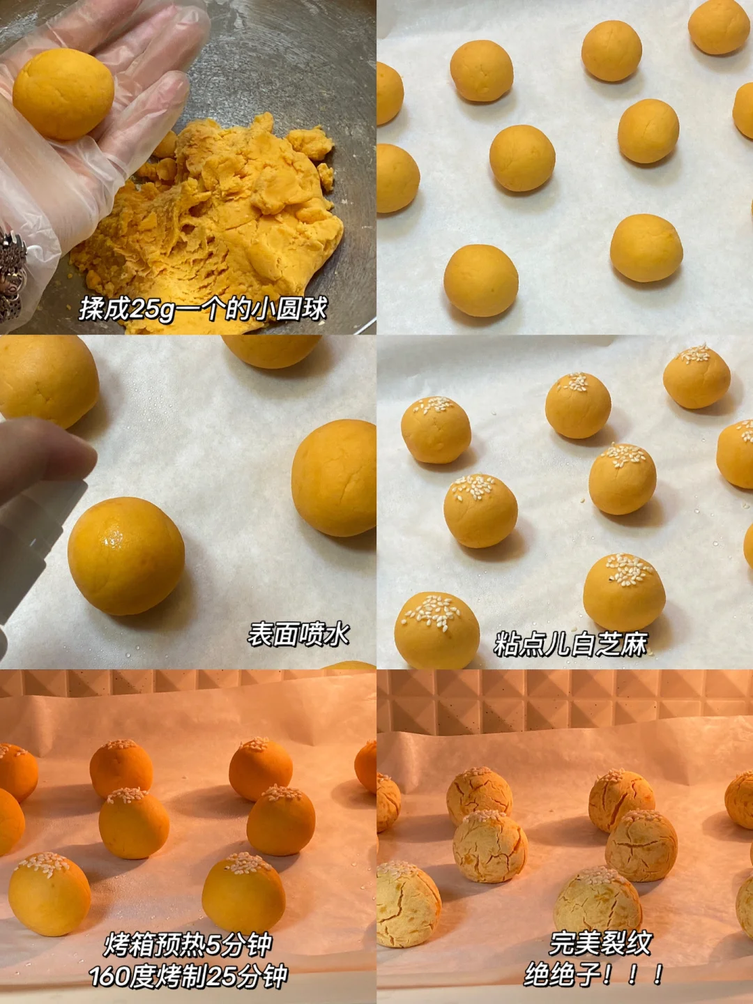食材:红薯250g,糯米粉65g,细砂糖25g,白芝麻适量。 做法:1.红薯上锅蒸熟碾压成泥。 2.加入糯米粉、细砂糖,揉成光滑面团。 3.揉成25g的小圆球,放在烤盘上,表面喷水,粘上点儿白芝麻。 4.烤箱提前预热5分钟,160度烤制25分钟。 完美裂纹,绝绝子[赞R][赞R][赞R]麻薯口感Q弹软糯!