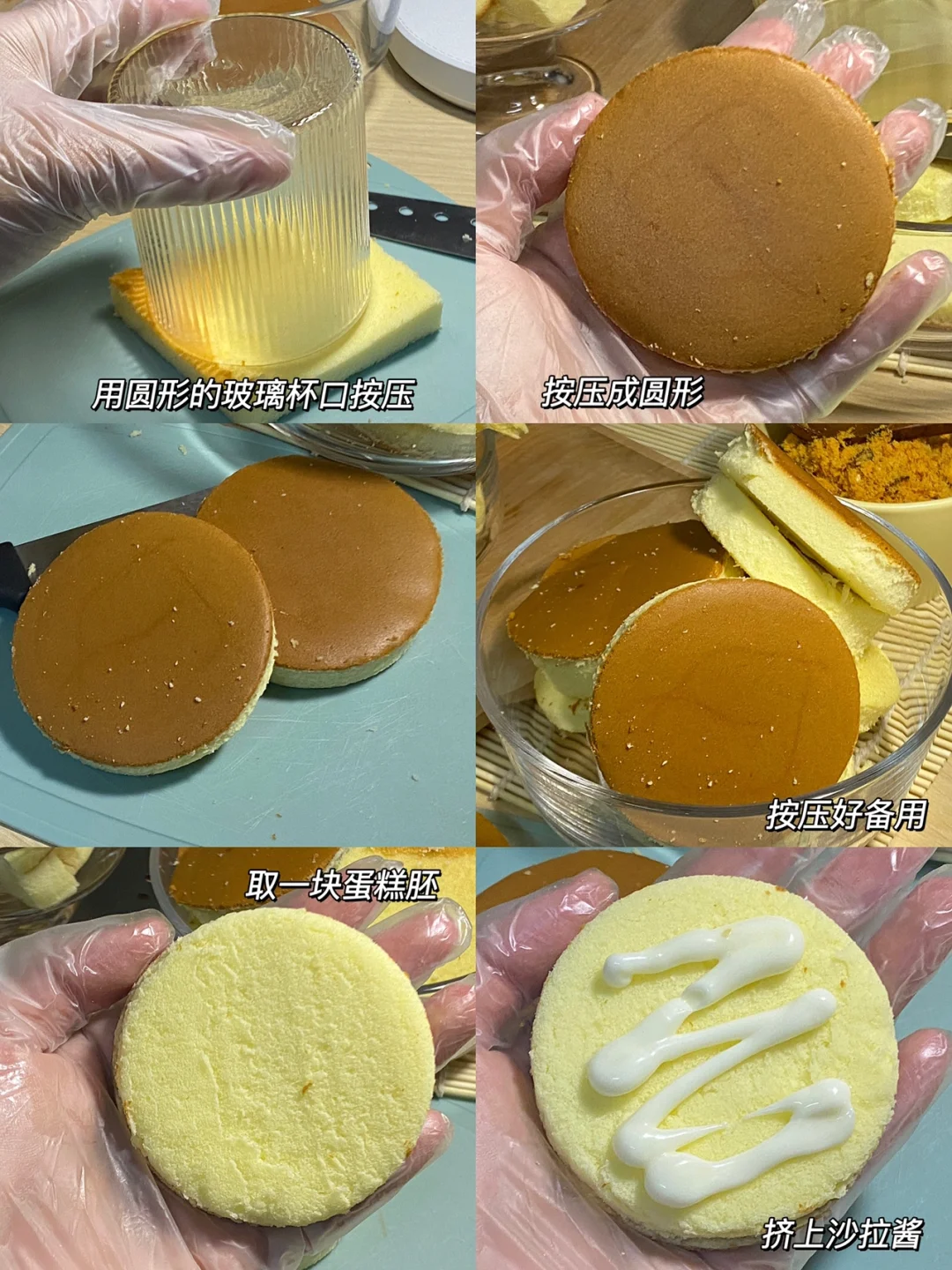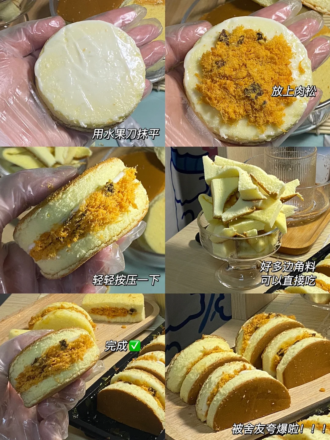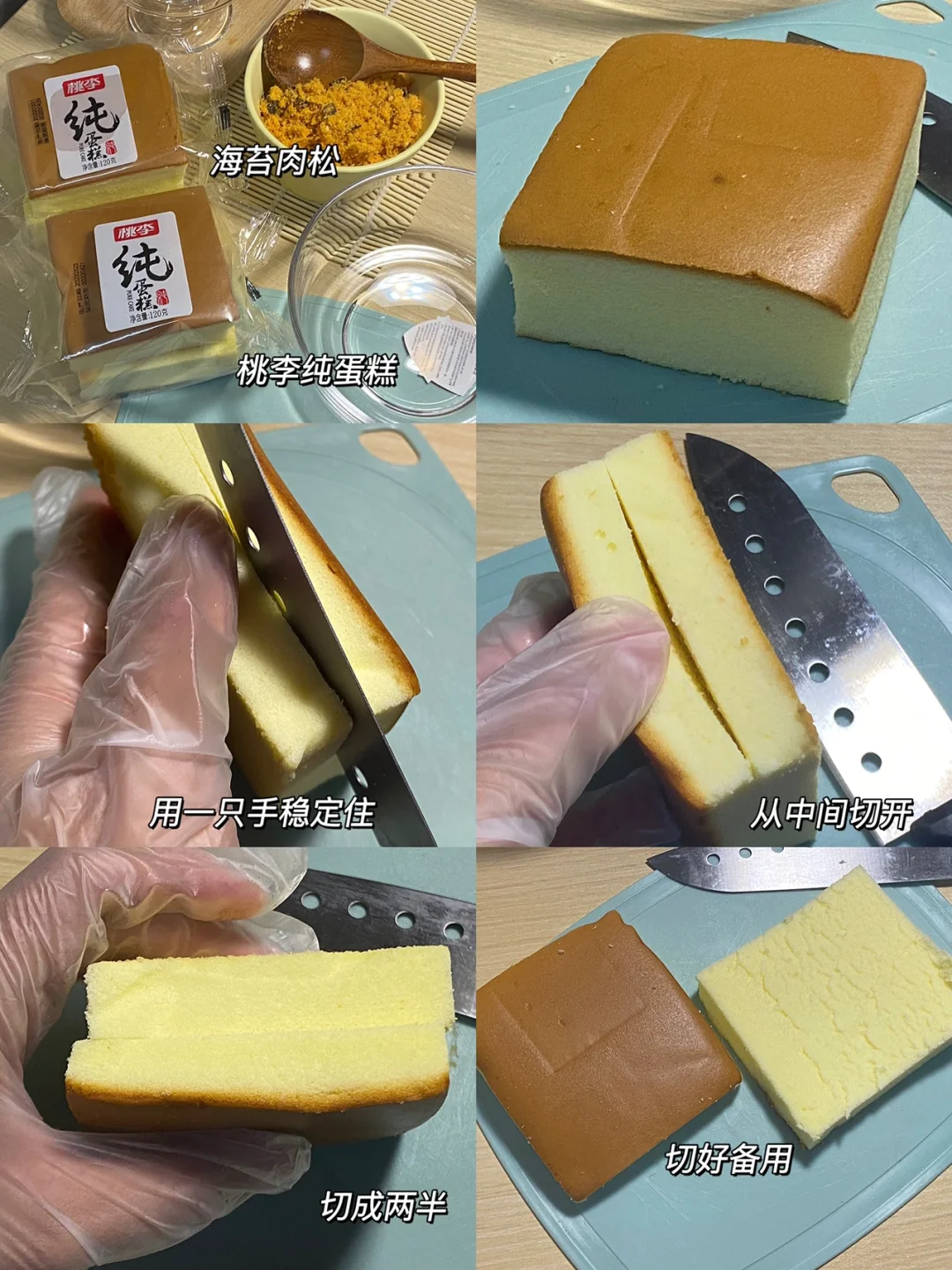 🧸食材:桃李纯蛋糕,肉松海苔,沙拉酱,圆杯口玻璃杯。 🧸做法:1.桃李纯蛋糕放在水果板子上,用一只手稳定住,从中间切开,切成两半,切好备用。 2.用圆形的玻璃杯口按压,按压成圆形,按压好备用,会有很多边角料,都可以直接吃哦。 3.取一块按压好的蛋糕胚,挤上沙拉酱,用水果刀抹平,放上肉松,再轻轻按压一下,完成✅ 🧸简易版肉松抱抱卷,被舍友夸爆啦,在宿舍就能做哦,赶紧冲吧姐妹们!!!