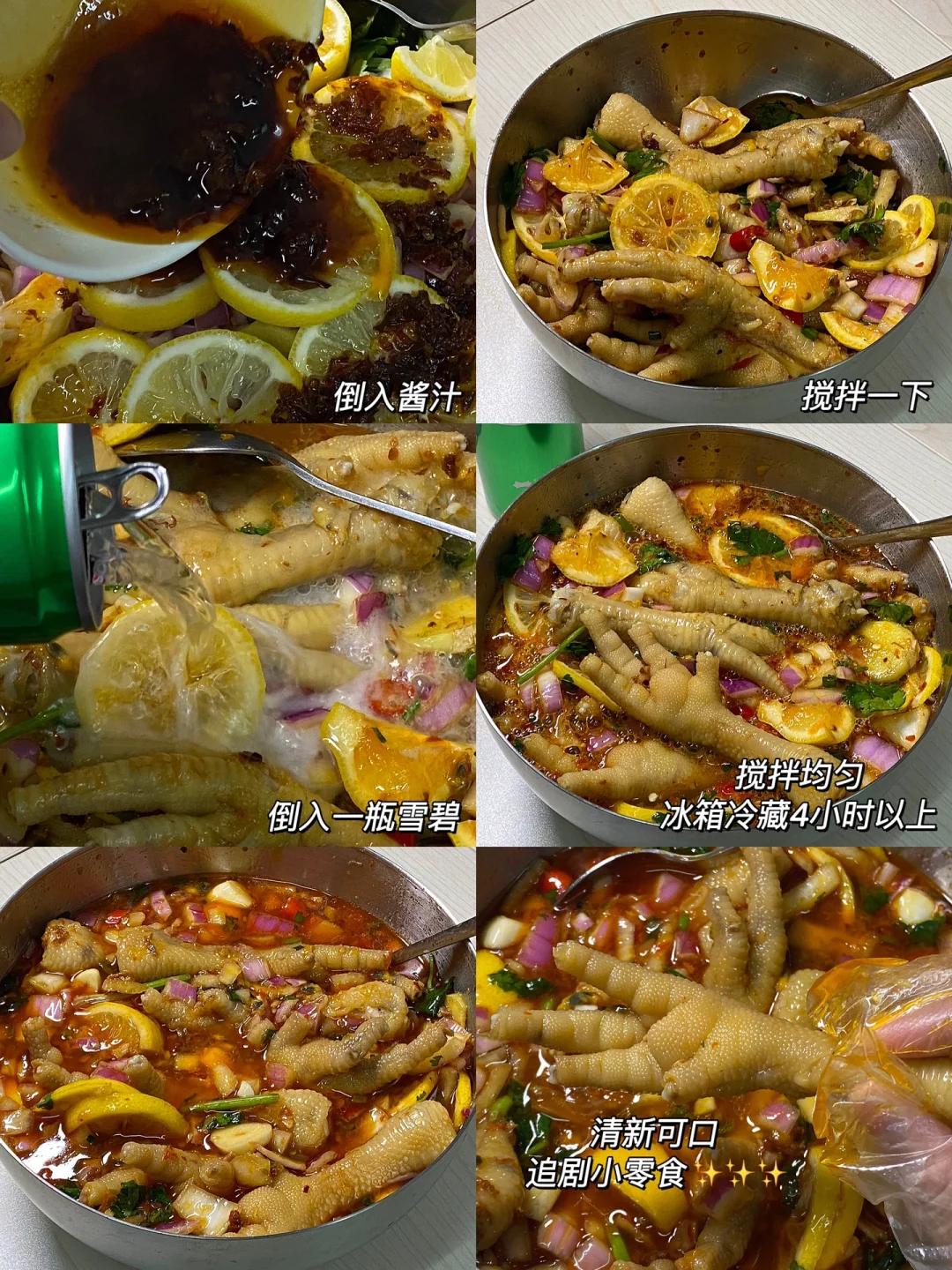 🌷食材:鸡爪500g,姜,蒜,香菜,葱,半个洋葱,小米辣四个,百香果两个,柠檬两个,雪碧一瓶。 🌷酱汁:5勺生抽,3勺陈醋,1勺蚝油,1勺香油,两勺老干妈。 🌷做法:1.鸡爪洗净,剪掉指甲,食材切好备用。 2.冷水下锅,放入姜片,放入鸡爪煮15分钟去腥。 3.捞出过冷水,多过几次,再放进冷水中泡一会儿。 4.倒入切好的食材,倒入酱汁,搅拌均匀,再倒入一瓶雪碧,冷藏4小时以上,口感更佳哦! 🌷清新可口,追剧小零食,赶紧做起来吧[赞R][赞R][赞R]