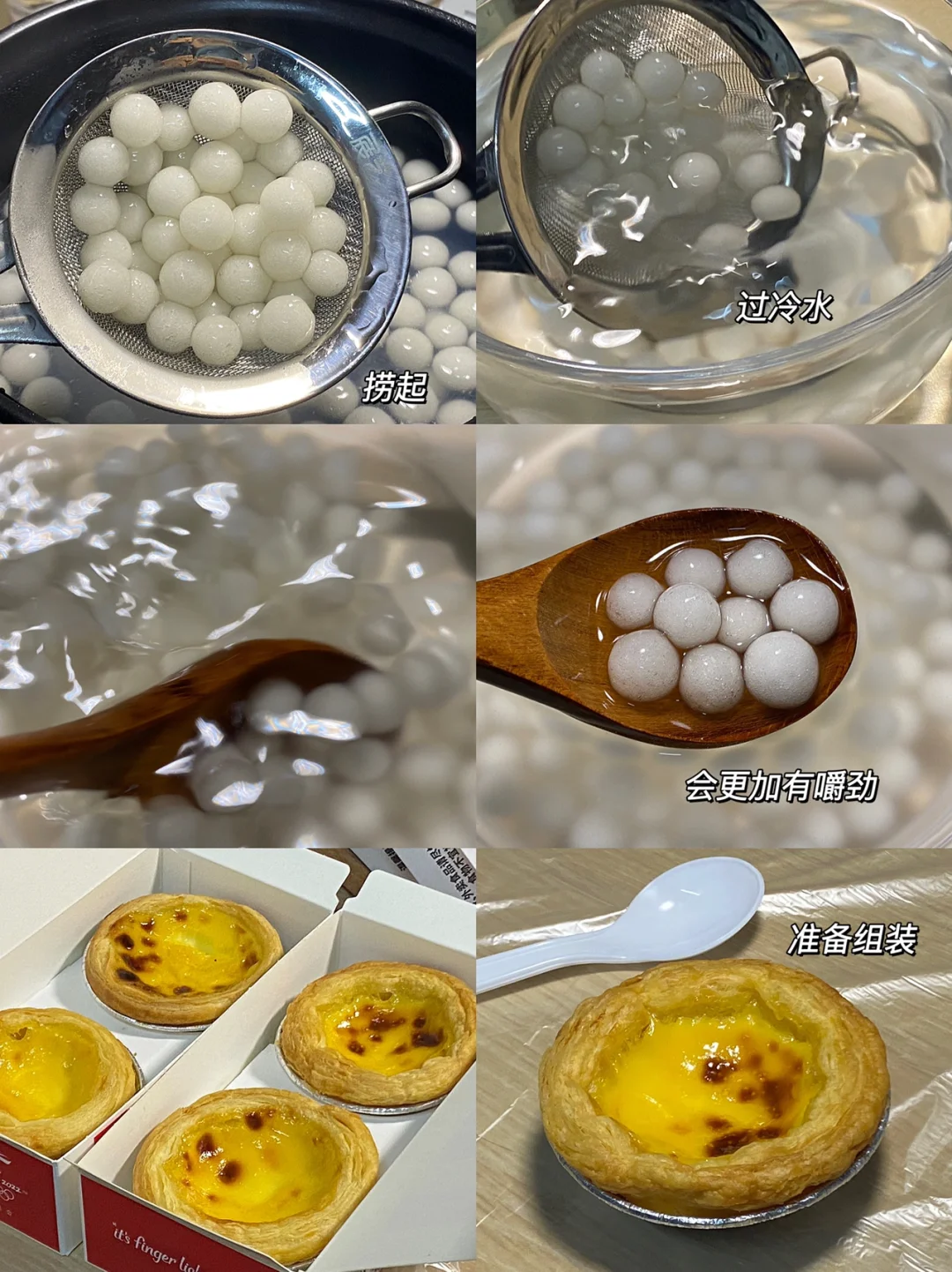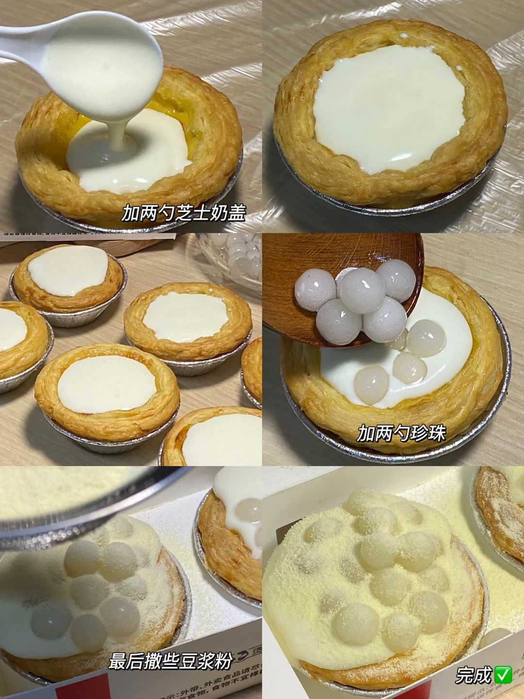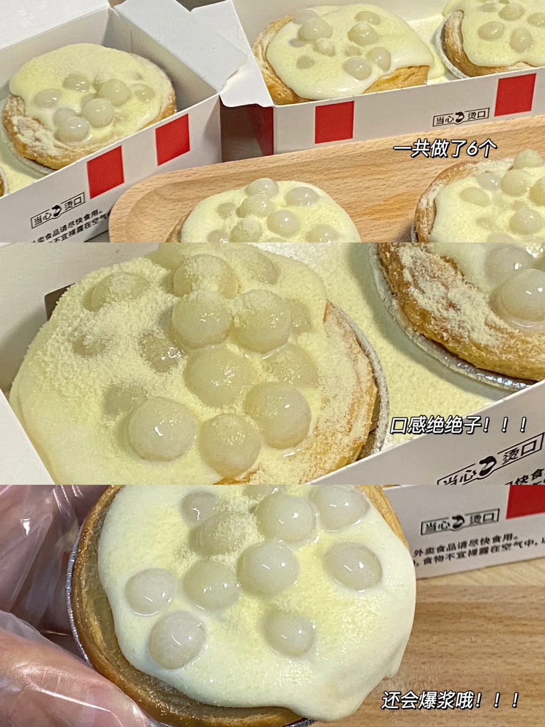 👩🏻🍳食材:肯德基蛋挞,芝士奶盖,珍珠(小丸子),豆浆粉。 👩🏻🍳做法:1.水煮沸,下珍珠,时不时用勺子搅拌搅拌,防止糊锅,煮至浮起即可。 2.捞起过冷水,会更加有嚼劲。 3.组装:两勺芝士奶盖,加两勺珍珠,最后撒上豆浆粉,完成✅ 👩🏻🍳一共做了6个,咬一口会爆浆哦!!! 👩🏻🍳糯唧唧的小珍珠,加上浓香的芝士奶盖,让整个蛋挞口感翻了好几倍[赞R][赞R][赞R]