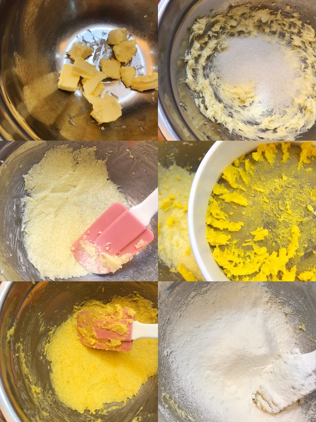 🐰食材:黄油80克,低筋粉85克,白糖(最好用糖粉,口感会更细腻)35克,盐1克,熟蛋黄两个,玉米淀粉80克。
