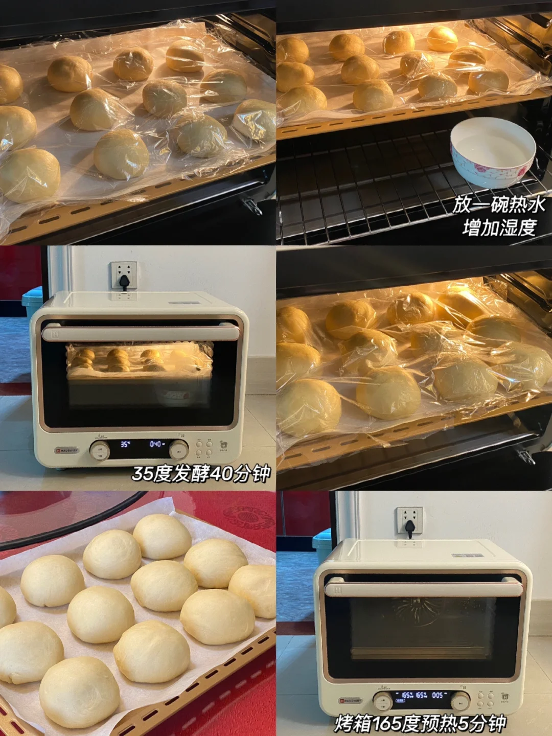 5.盖上保鲜膜进行第二次发酵,36度发酵40分钟,同样旁边放一碗热水增加湿度。
