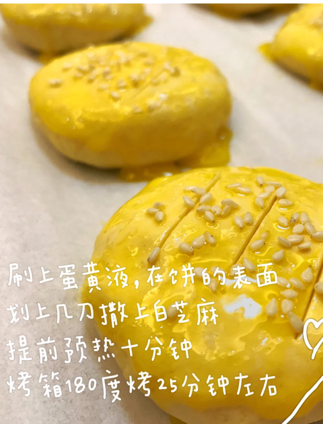 9.依次做好放在铺有油纸的烤盘上,表面刷上一层蛋液,用水果刀割3刀,再撒上白芝麻。