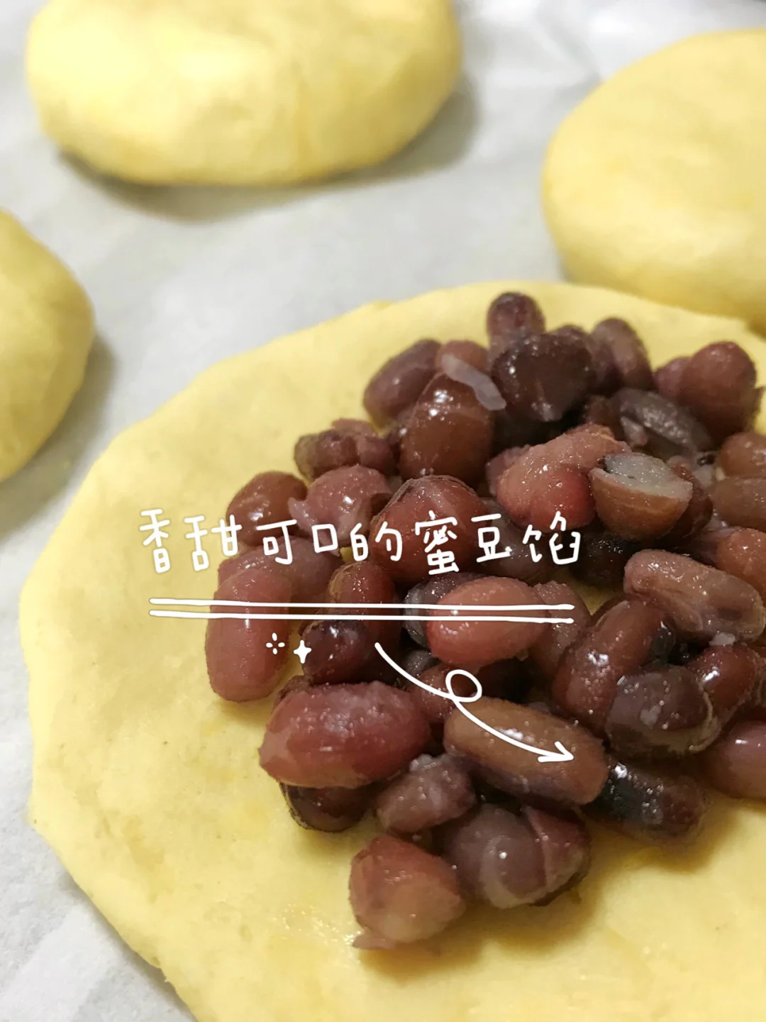 8.放入做好的蜜豆,用虎口收紧收口,然后压一压成饼状。