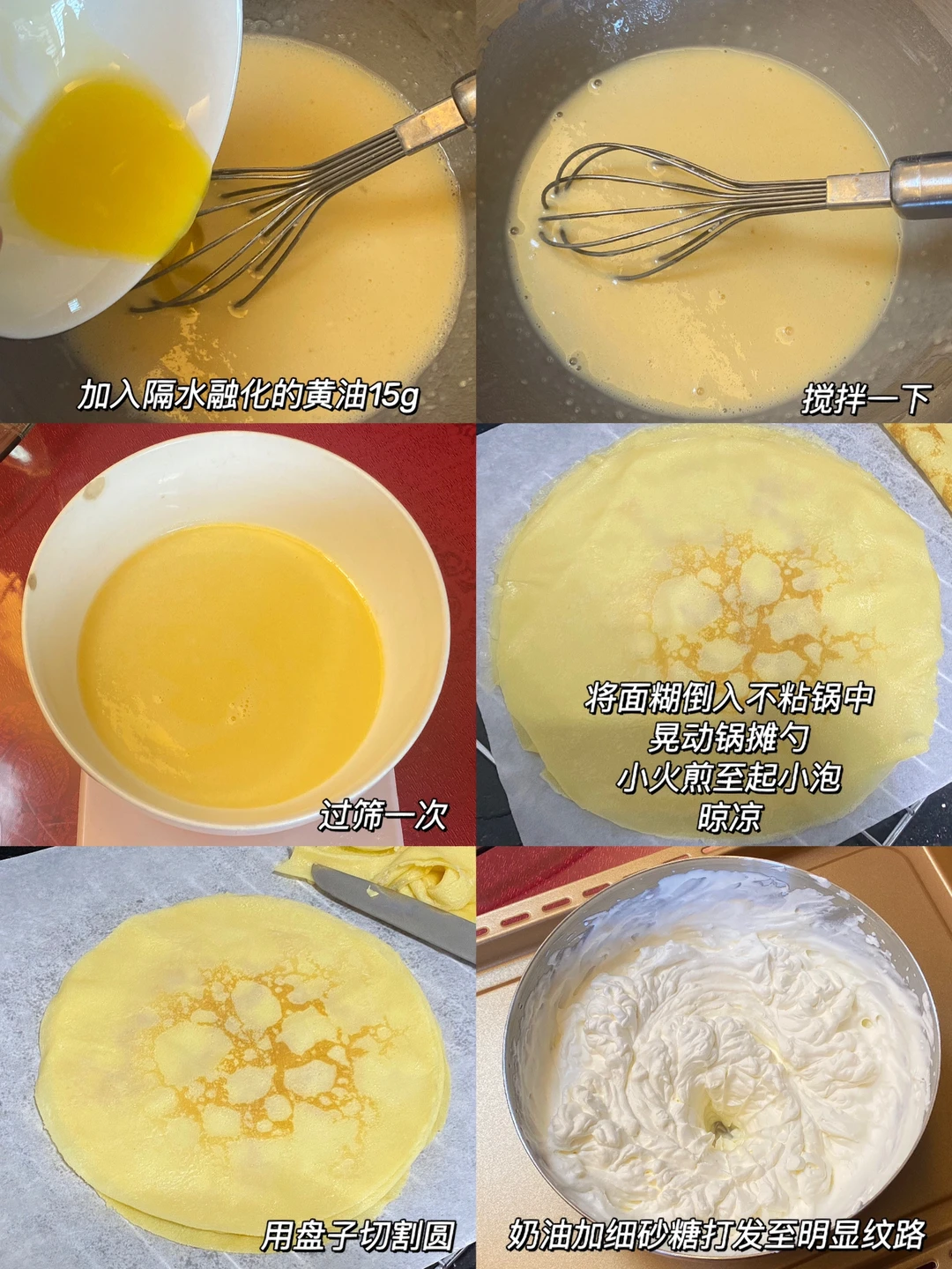 2.将面糊倒入不粘锅中,晃动锅摊勺,全程小火煎至起小泡,晾凉。