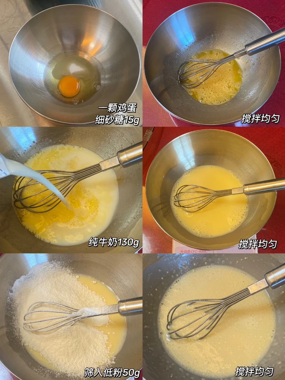 🌼做法:1.鸡蛋、细砂糖、纯牛奶搅拌均匀,筛入低粉,搅拌均匀,加入隔水融化的黄油,搅拌一下,过筛一下。