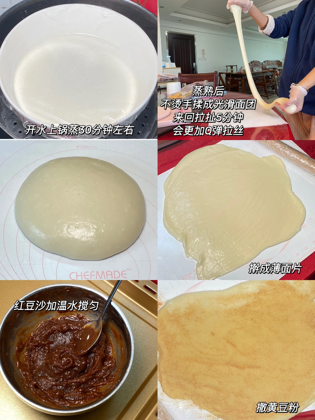 3.蒸熟后,不烫手时来回拉扯5分钟左右(记得一定要戴手套,不然会很粘,这样可以使面团更加Q弹拉丝)
